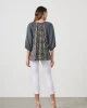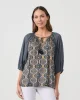 Kosmos Print Blouse CZ1015 by Caju at The Wardrobe . Soft and floaty material Special beaded tassels Elastic wide cuffs Raglan sleeve Best selling blouse shape Special double print Relaxed fit Designed in Australia 100% Viscose Modal