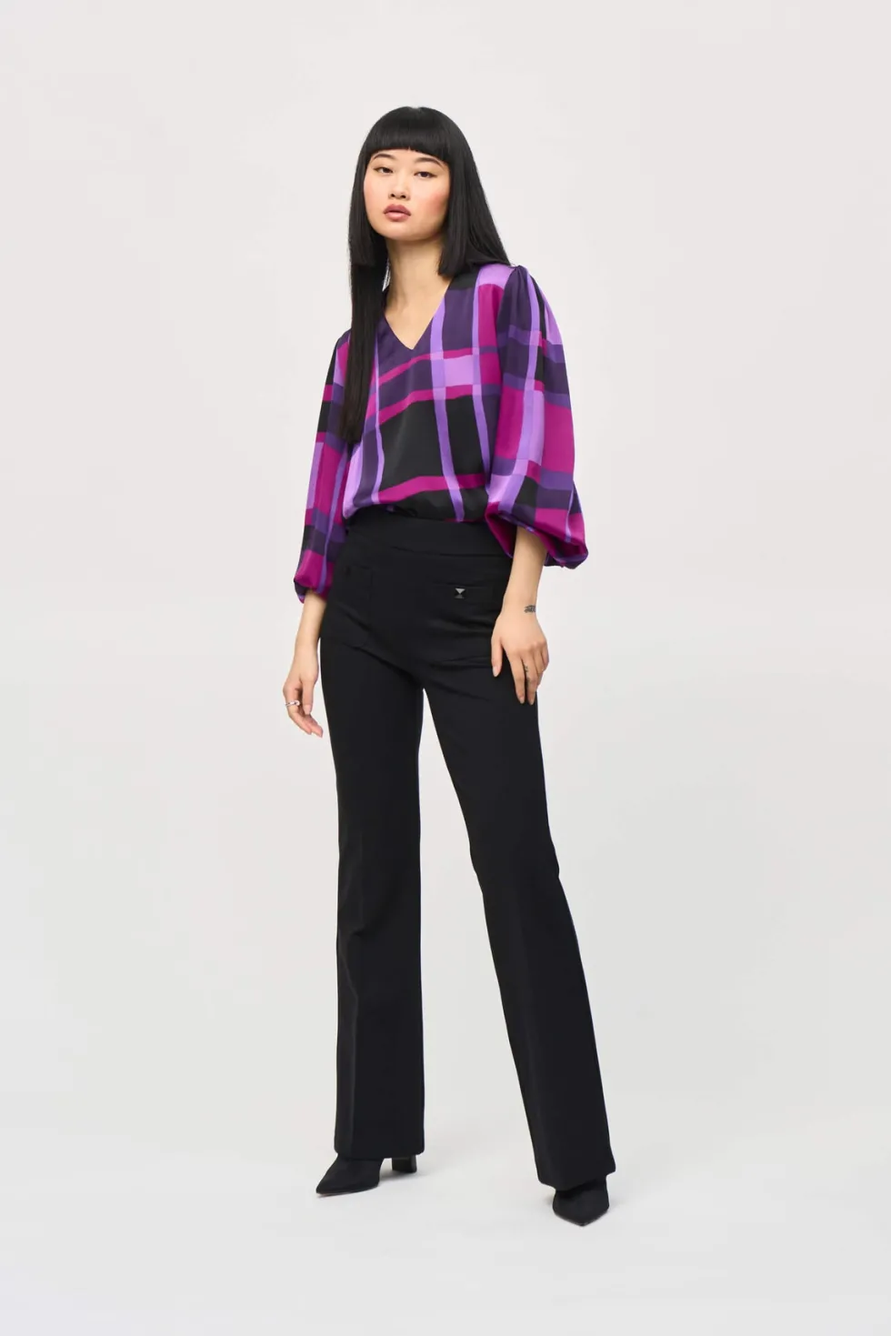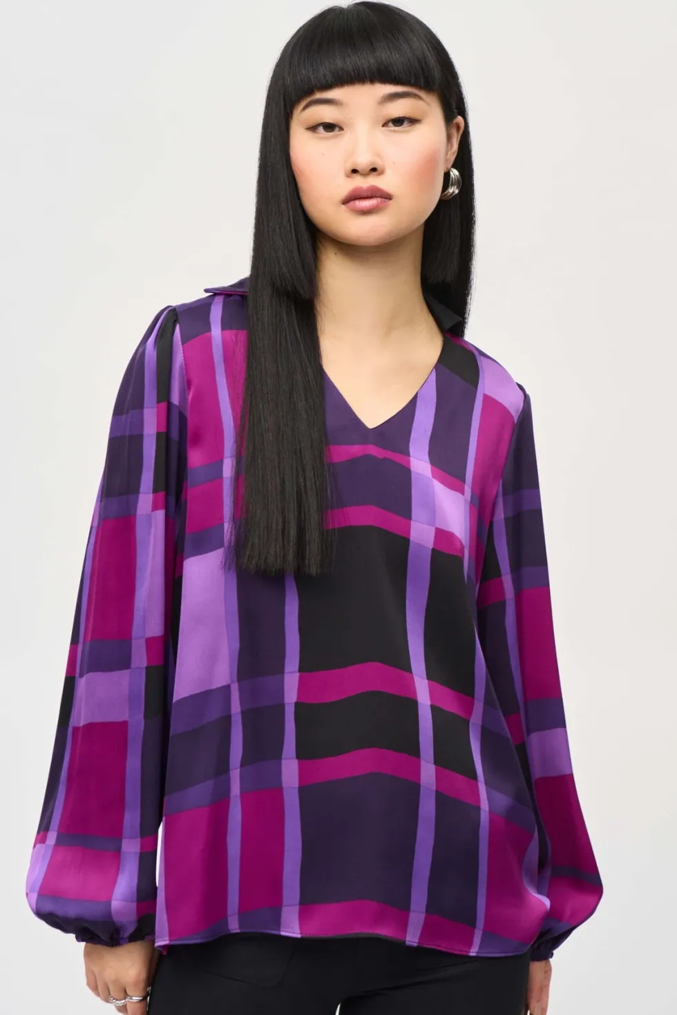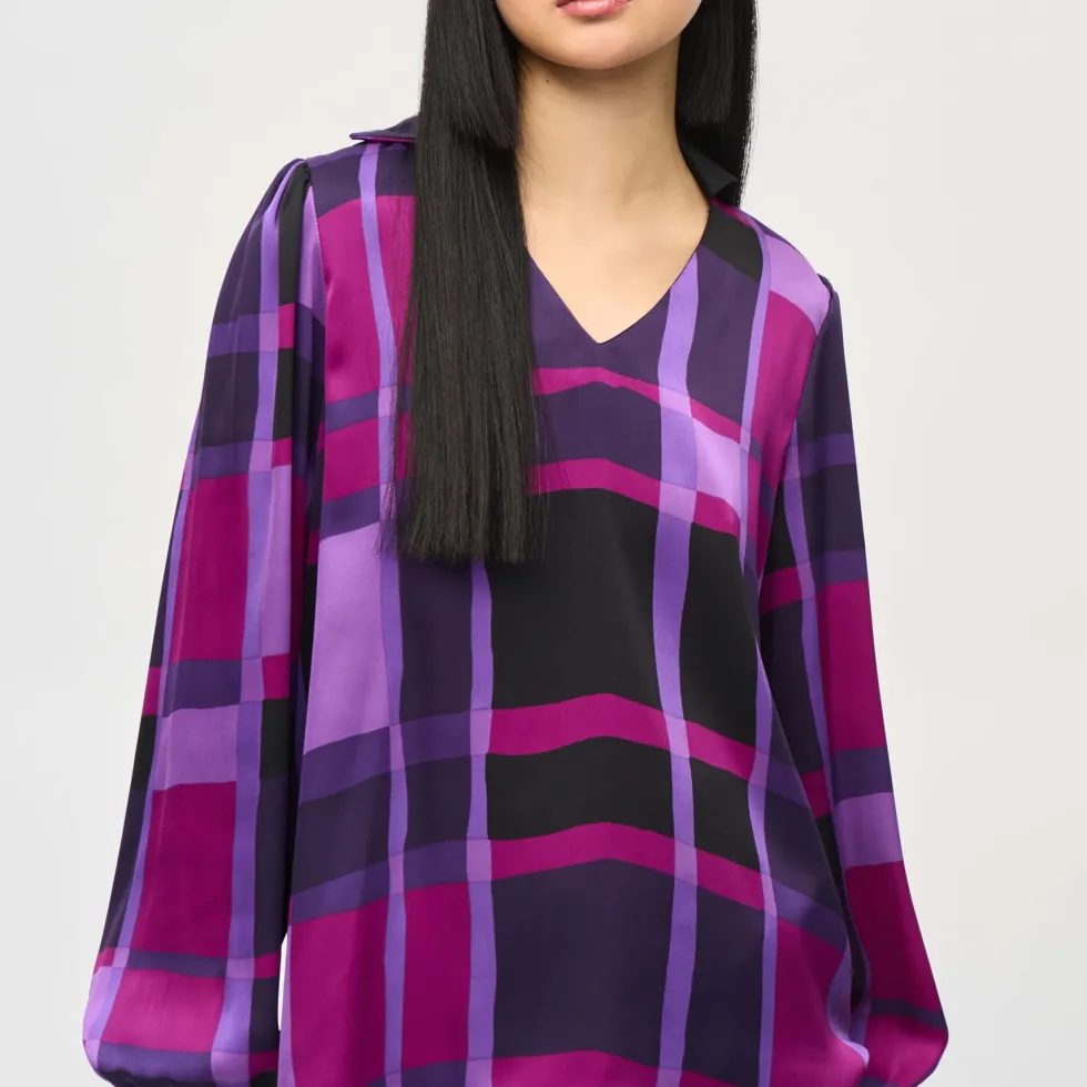 Liberty Satin Abstract Plaid Print Top 243058 by Jospeh Ribkoff at The Wardrobe This is a sale item and is only eligible to return for a store credit or exchange.The essence of contemporary style, this satin top carries undeniable charm. The design features an alluring abstract plaid print that highlights your flair