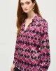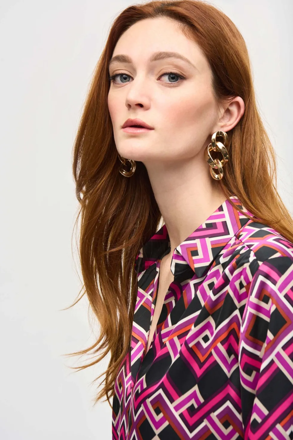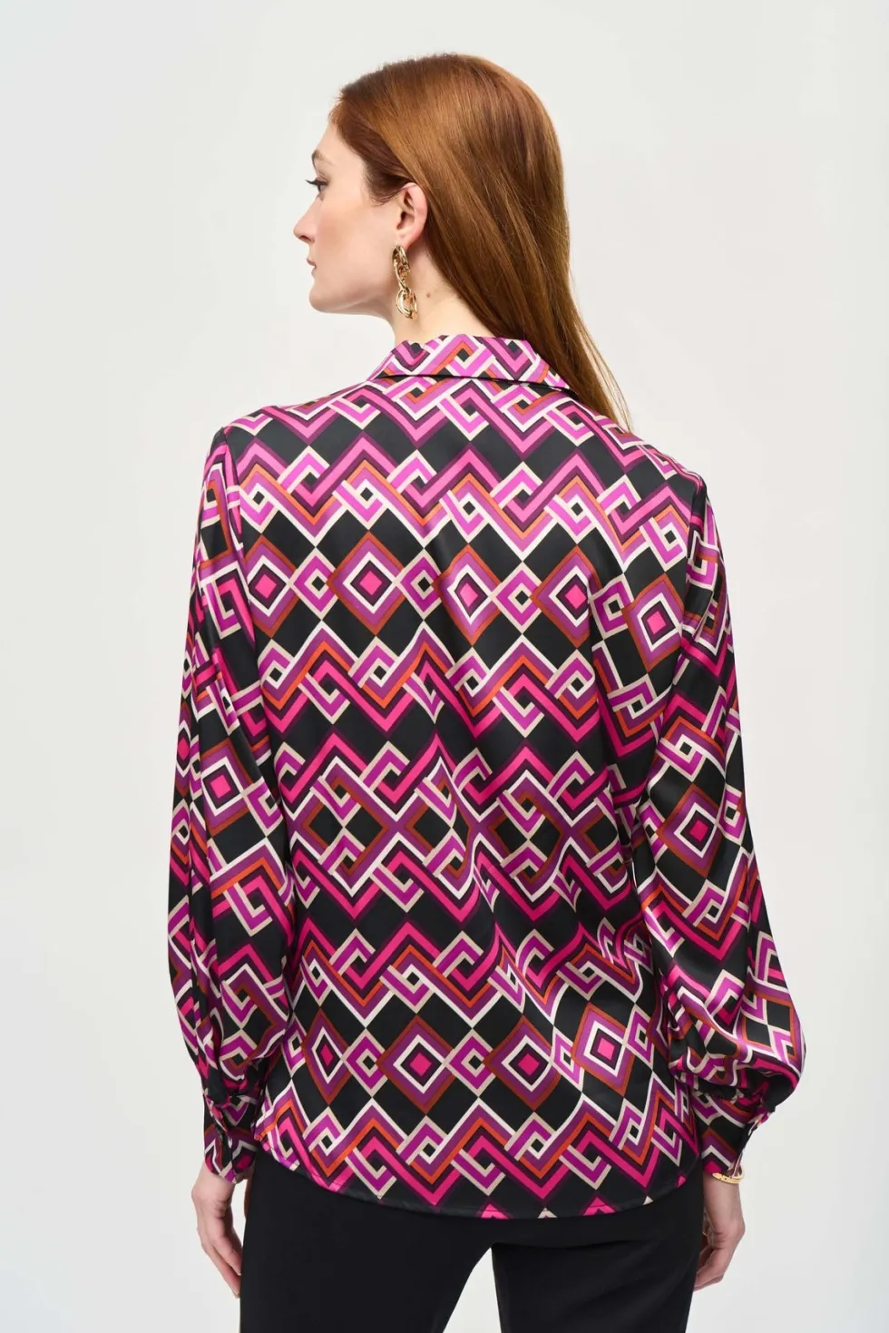 This is a sale item and is only eligible to return for a store credit or exchange. Add bold contemporary flair to your every day look with this exquisite satin top. This garment serves understated elegance with its lively geometric print, elevating the garment’s classic straight silhouette. The shirt collar and long pu
