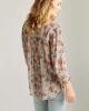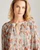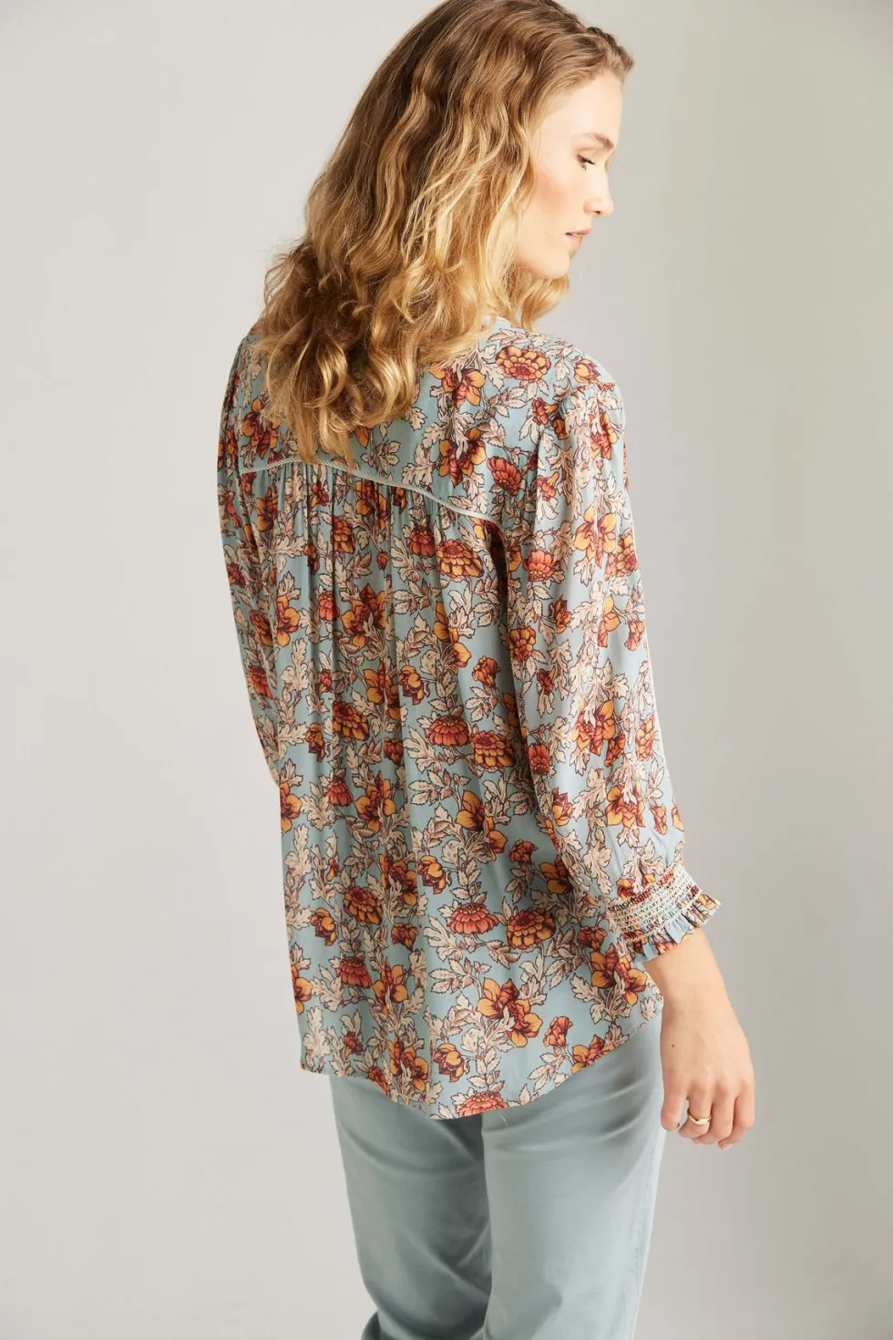 Holly Top – Seafoam 3408 by Lania The Label at The Wardrobe Gathers around the shoulders and sleeves add a soft fluidity to the Holly Top. This elevated style features a delicate and feminine floral print, contrast binding and tie details at the centre front. The shirred cuff with contrast embroidery thread detail adds