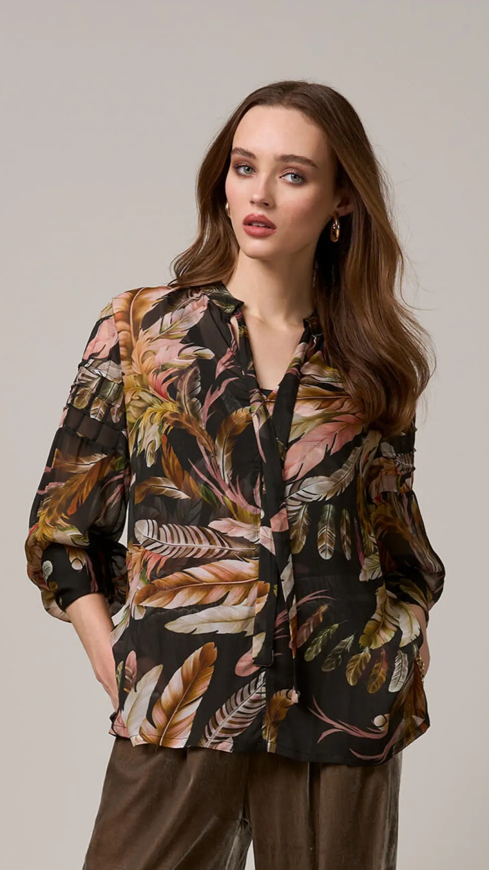 Featherington Blouse – Black Multi LS2946 by Loobie's Story at The Wardrobe. Sheer blouse with a centre front tie through collar channel to secure keyhole. Featuring tuck detail design on top sleeves with deep cuffs. Includes printed cami. 100% Viscose Cool hand wash using mild detergent. Do not machine wash, do not ru