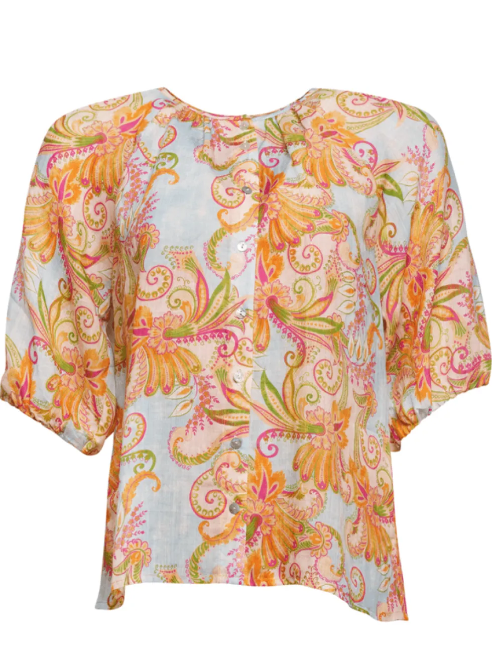 Round neck, button-through printed blouse with gathering around the neckline, and slightly puffed elbow length sleeves with soft undercased elasticated cuffs. Colours:Blue MultiComposition:100% RamieCare Instructions:Gentle cold machine wash with like colours using mild detergent. Do not rub/soak/wring/bleach. Do no