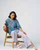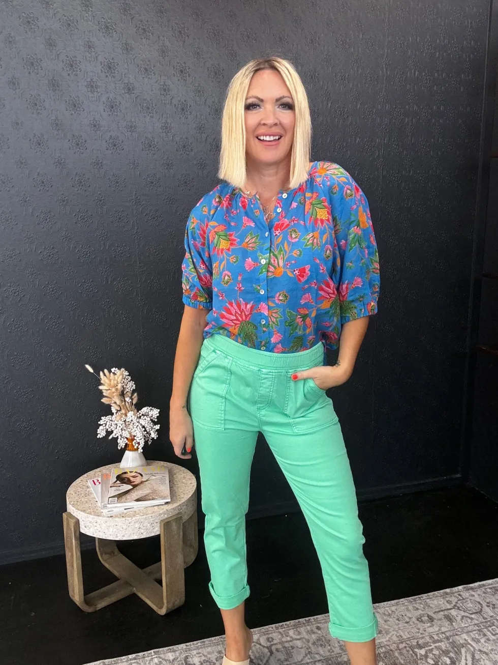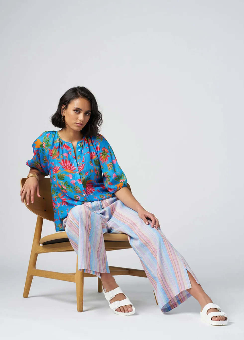 Round neck, button-through printed blouse with gathering around the neckline, and slightly puffed elbow length sleeves with soft undercased elasticated cuffs. Colours:Blue MultiComposition:100% RamieCare Instructions:Gentle cold machine wash with like colours using mild detergent. Do not rub/soak/wring/bleach. Do no