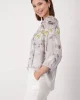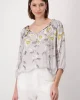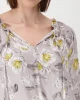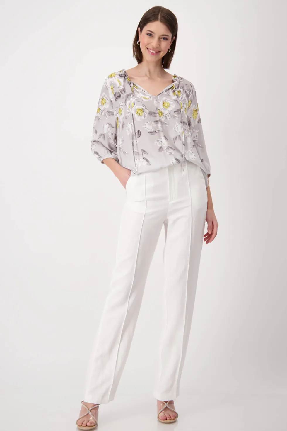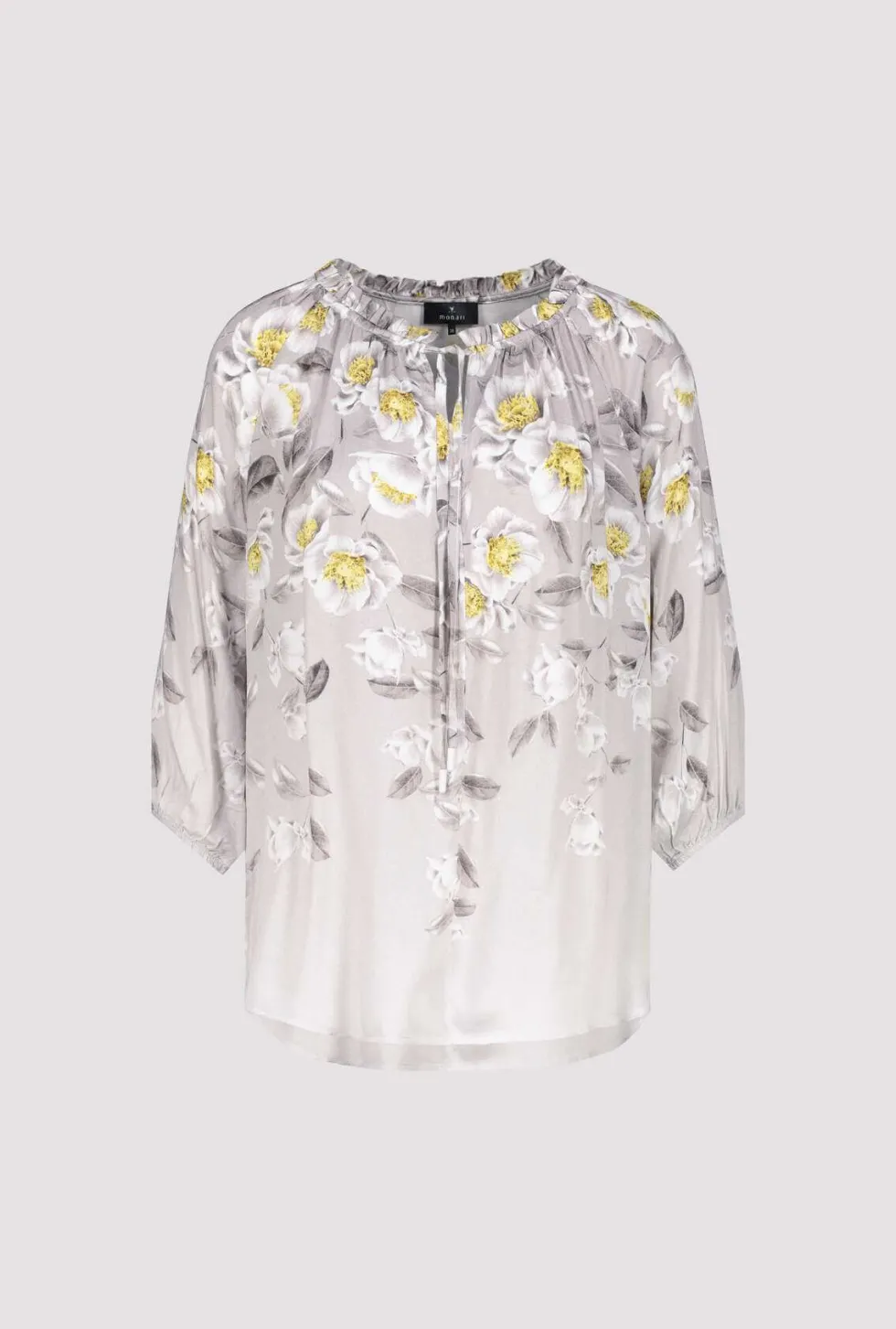 Flower Blouse 408665 by Monari at The Wardrobe. The blouse made of 100% viscose impresses with its all-over floral patternand the feminine round neck with slit and ruffles.