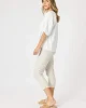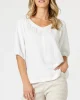 Lino V Neck Top 48258 – White by Gordon Smith at The Wardrobe Features: Relaxed, breathable, and effortlessly polished – theLino V-Neck Top is crafted from a lightweight linen blend that’s perfect for warm days and easy layering. Featuring a softgathered V-neckline, elbow-length sleeves with elasticated cuffs, and a