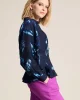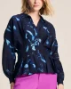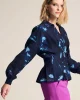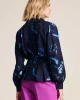 Feathers & Florals Blouse 7959 by Pom Amsterdam at The Wardrobe. This dark blue blouse features a unique feather print inspired by the many layers of a feather. The blouse has a V-neckline and is finished with pleats that accentuate the waist. This is a more sustainable item.