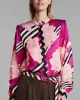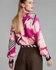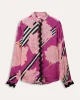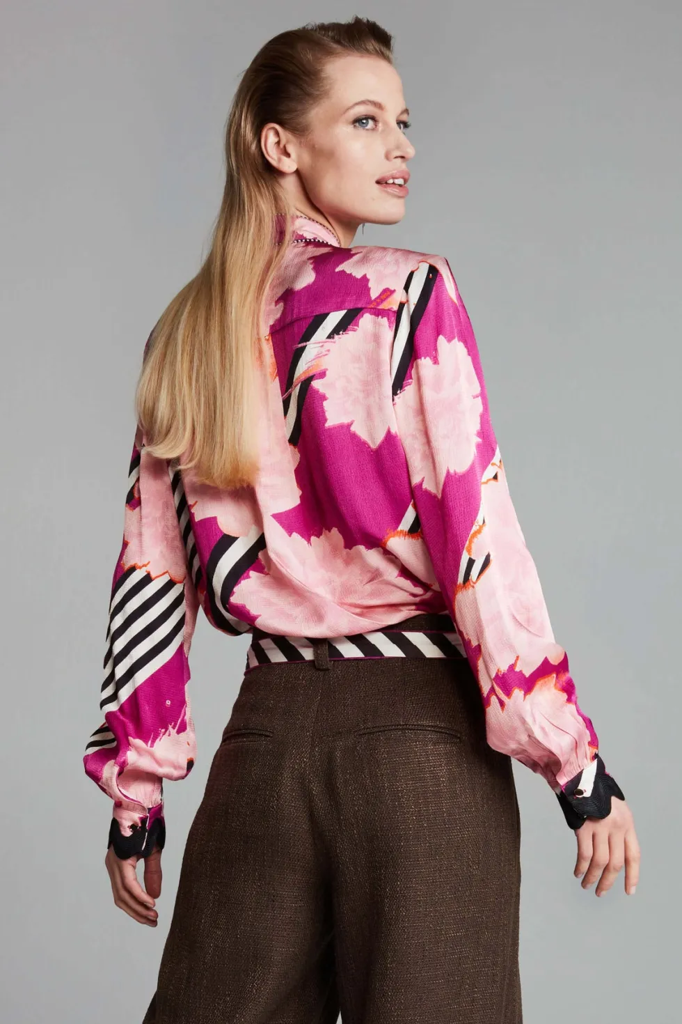 Taylor Blouse 7907 by Pom Amsterdam at The Wardrobe. This beautiful pink blouse features a floral print with black and white stripe pattern. The print was designed by fashion designer Claes Iversen. The blouse has a beautiful finish on the neckline typical of Claes' designs. The blind button row has an elegant wave eff