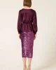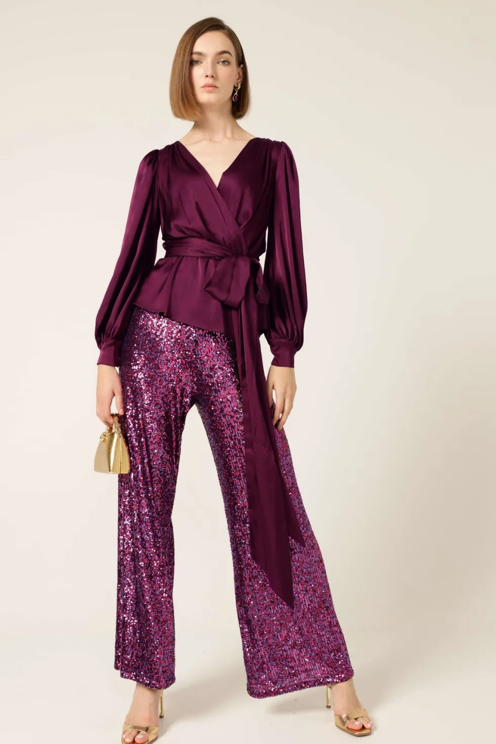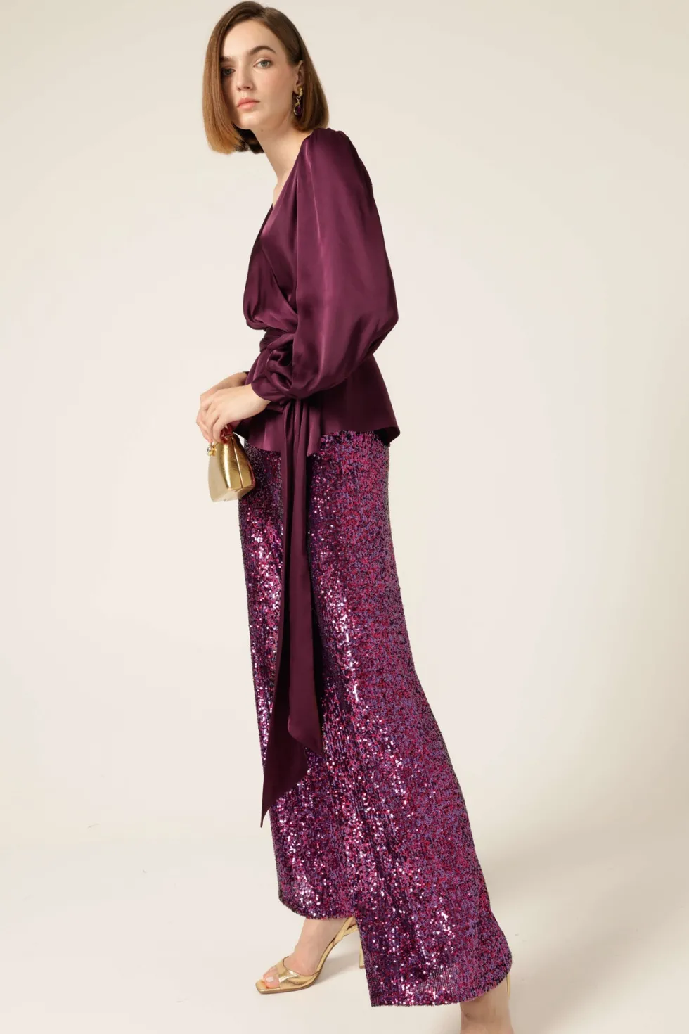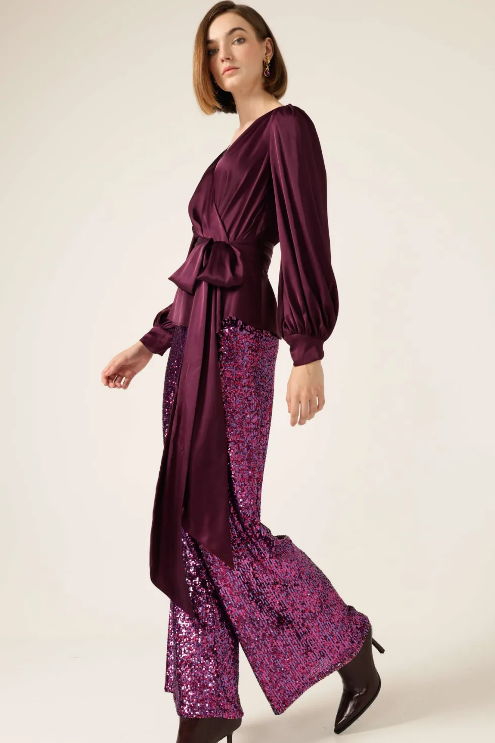 TheSatin Faux Wrap Top in Black Cherry by Sacha Drake at The Wardrobe,defines timeless design with its luxurious soft satin, flattering faux wrap design, and double-layered peplum. Featuring an elasticated waist, self-tie belt, and bloused sleeves with cuffs, this effortless pull-on style is perfect for both work or