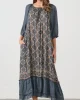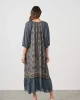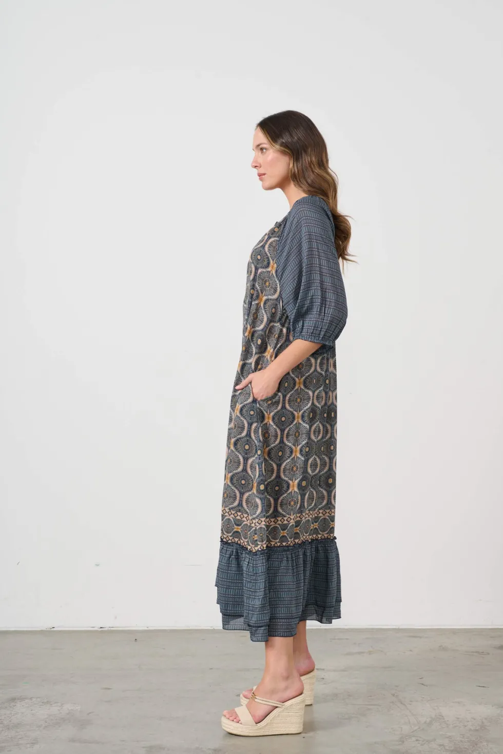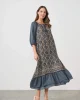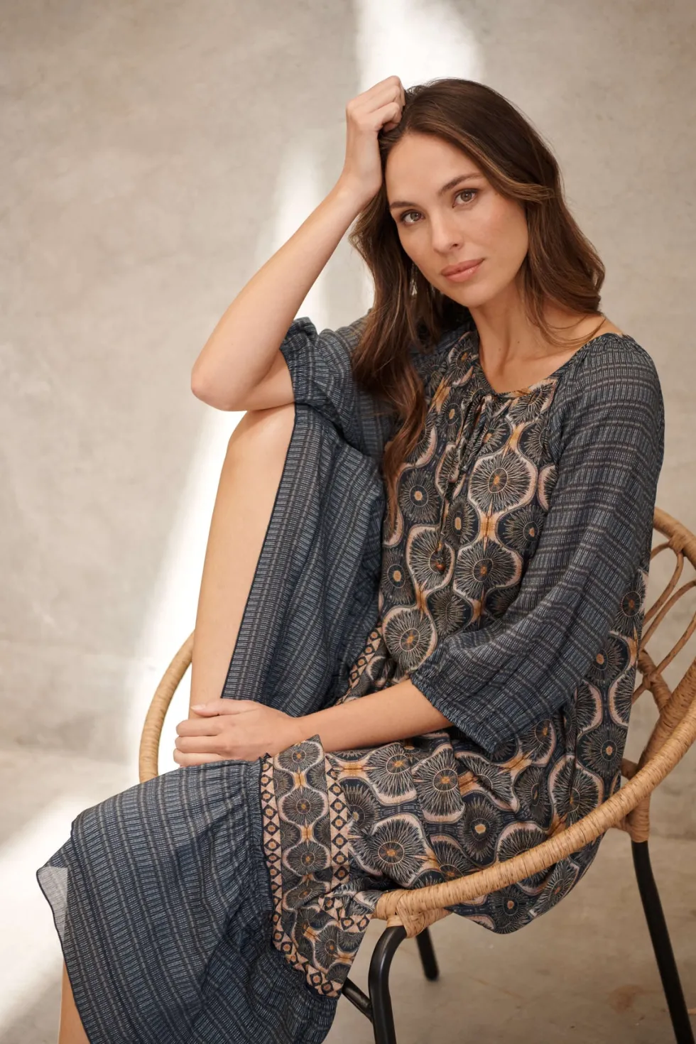 Kosmos Print Raglan Sleeve Dress CZ1018 by Caju at The Wardrobe . Soft and floaty material Special beadtassels Relaxed fit Side pockets Elastic cuffs Raglan sleeve Special double print Border print at hemline Double layer hemline Designed in Australia 100% Viscose Modal Lining: 100% Cotton