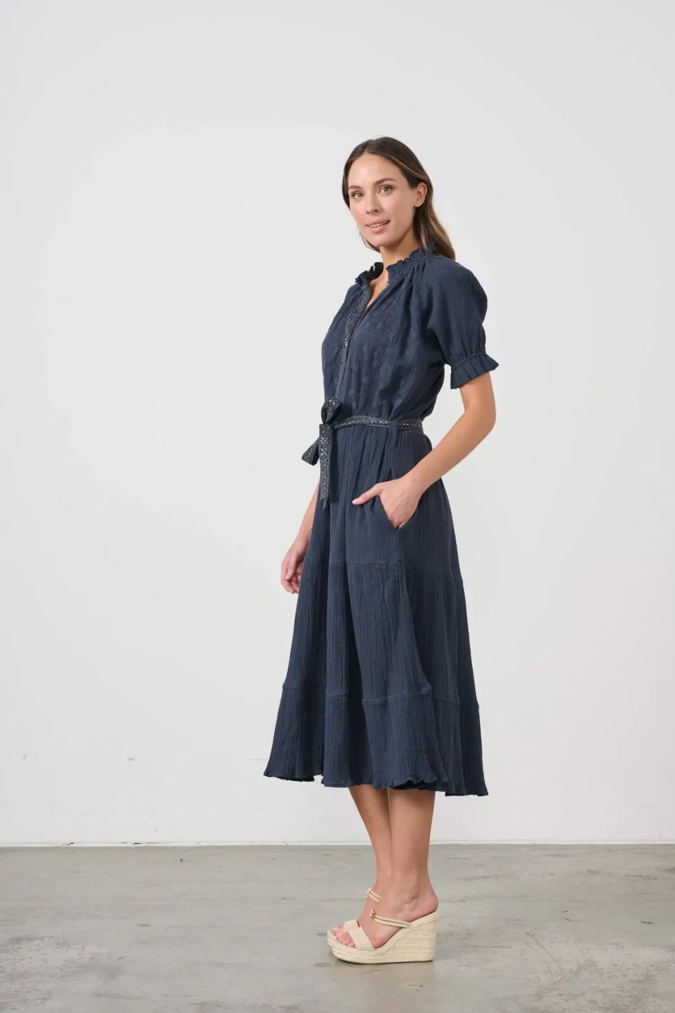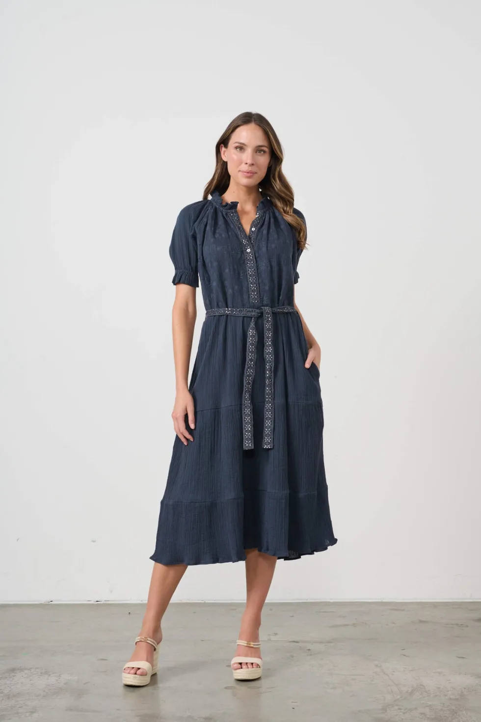 Self Coloured Embroidery & Belt Dress CZ1054 by Caju at The Wardrobe . Special self-coloured embroidery Delicate micro-sequins for sparkle Waist belt with belt loops Side pockets Feminine shape Relaxed fit Unlined raglan sleeve Buttoned neckline Lined in 100% Cotton Handwash separately in warm water. Use mild det