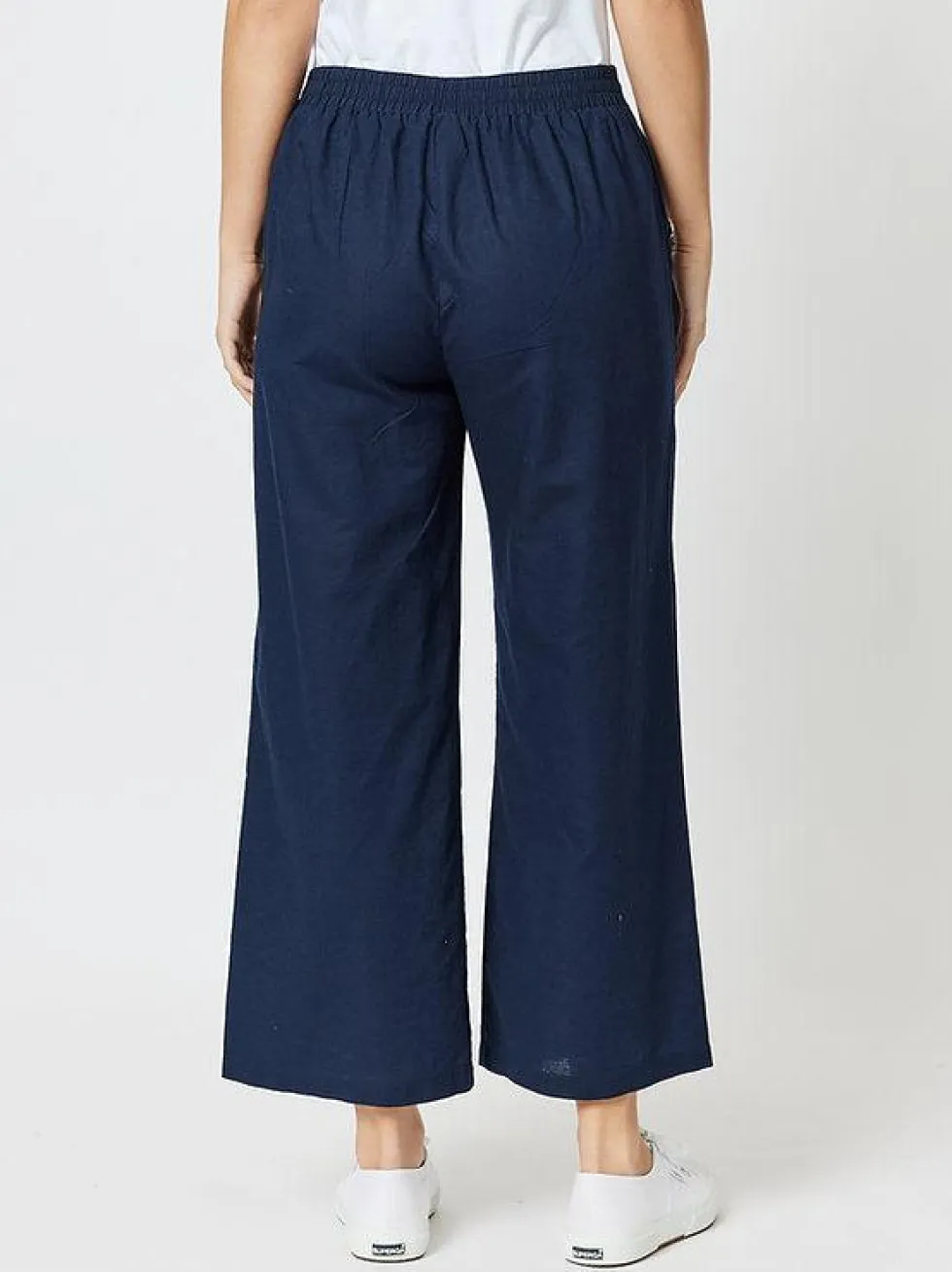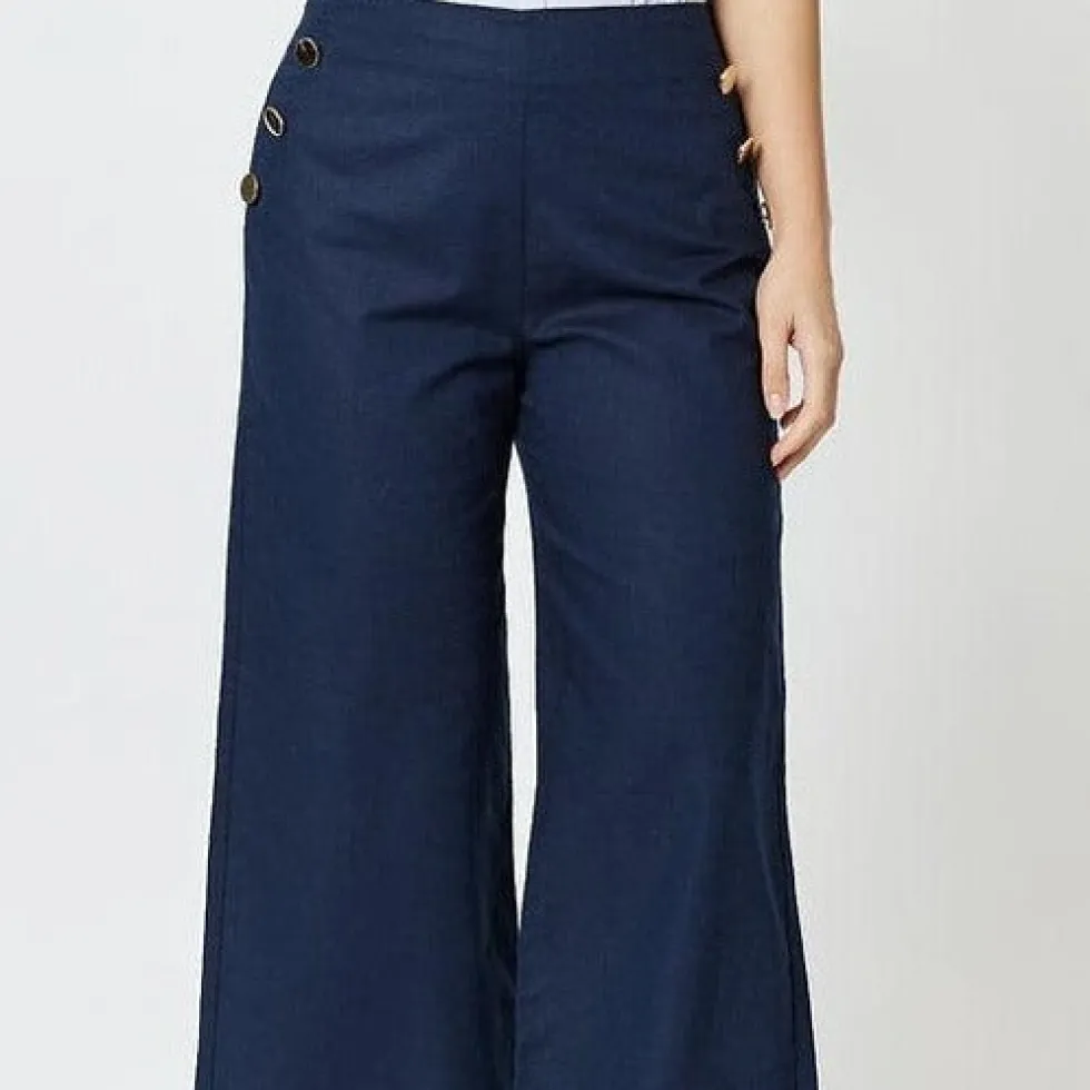 15% Linen / 45% Cotton Cotton/Linen Blend Flat front featuring gold buttons at faux pockets Pull-on, relaxed fit High Waisted Covered back elastic waistband Wide leg Model wears size 10/S and stands 176cm tall.