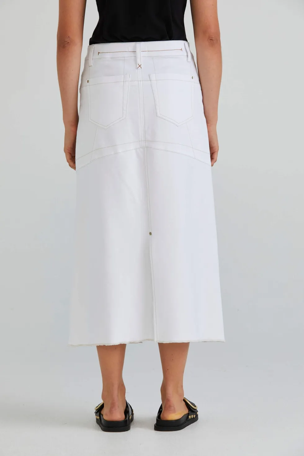 Rhode Skirt – White 3634 Lania The Label at The Wardrobe Elevate your denim collection with the Rhode Skirt, a midi-length design crafted with a contrast top-stitched panels for added detail. The bias-cut lower skirt and shaped back darts ensure an exceptionally flattering fit. Complete with a splits, featuring rive