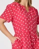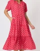 French Rose Midi Dress 48468 by Gordon Smith at The Wardrobe Bring playful charm to your wardrobe with the French Rose Spot Print Dress. Showcasing a vibrant red base adorned with crisp white polka dots, this classic Gordon Smith silhouette features a partial button front, short sleeves, and a flowing tiered skirt for