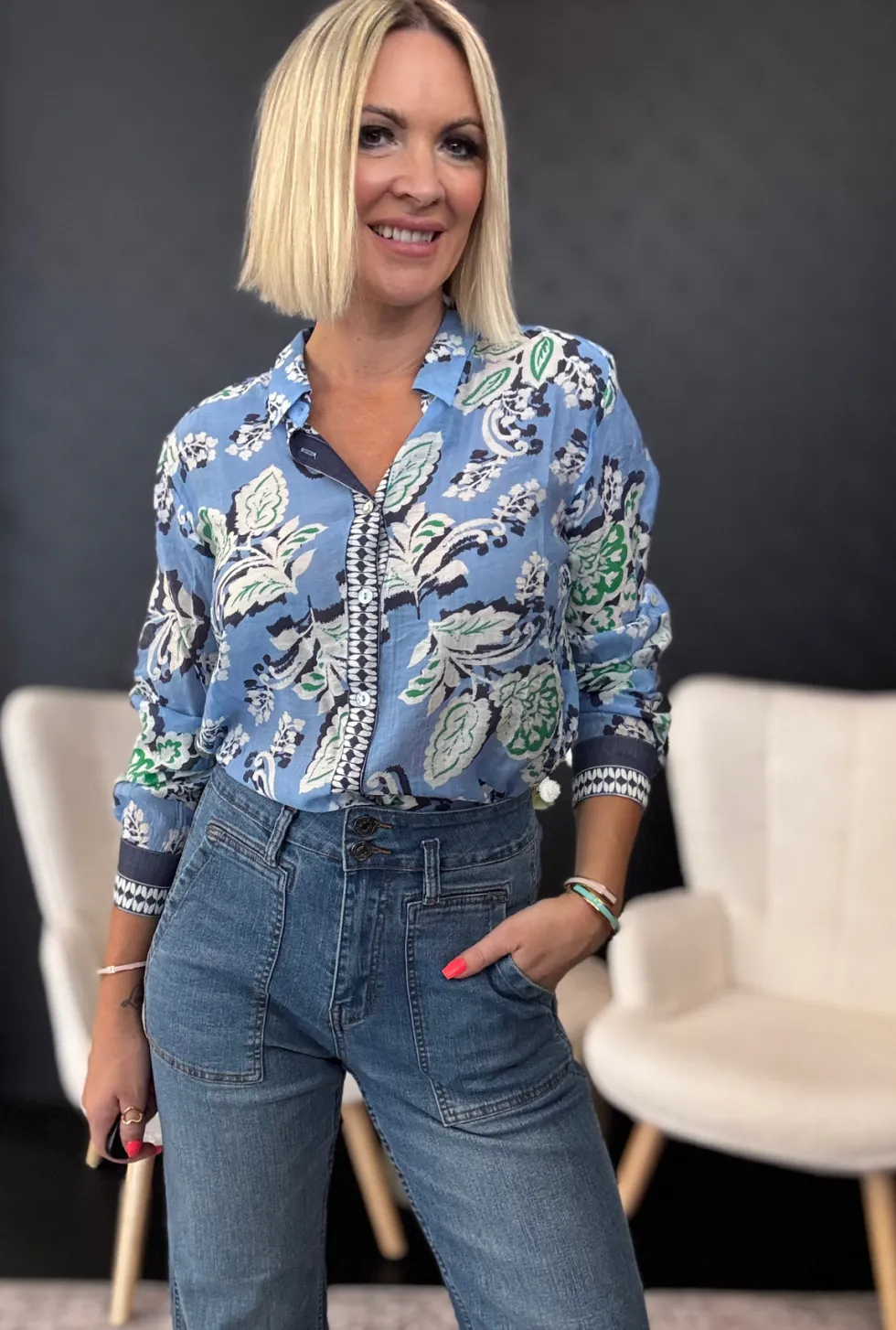 Your next favourite Shirt at The Wardrobe . The Coastal Print Shirt 46809 a season less wardrobe staple, offering both style and versatility Designed with a flattering high-low hem, it provides the perfect amount of bottom coverage for a comfortable yet polished look The floral contrast print adds a touch of charm, m