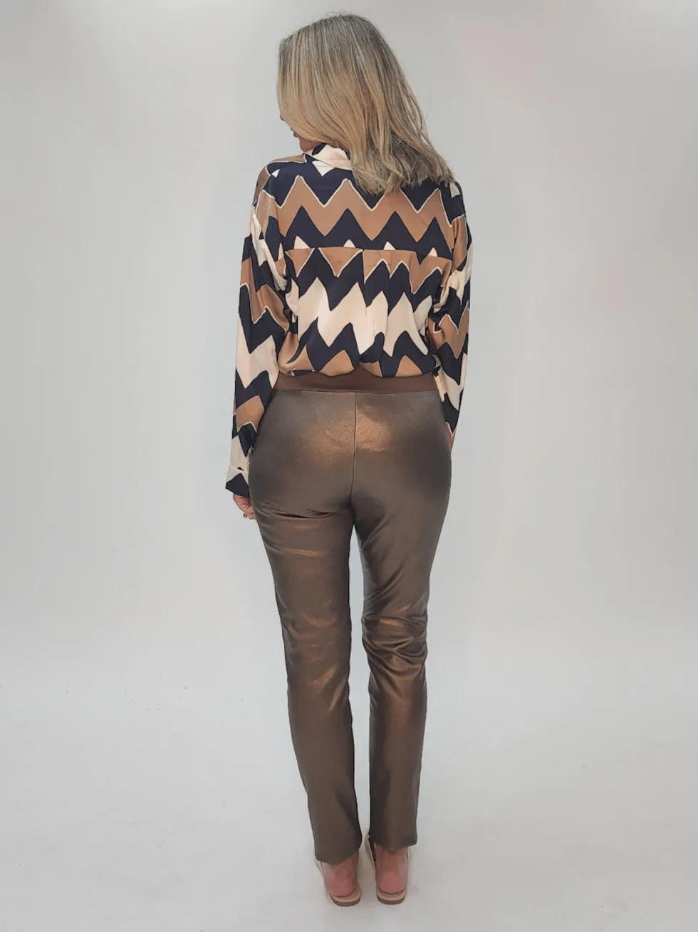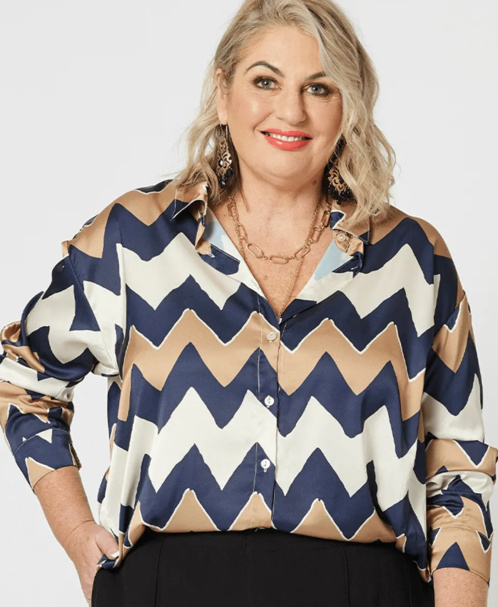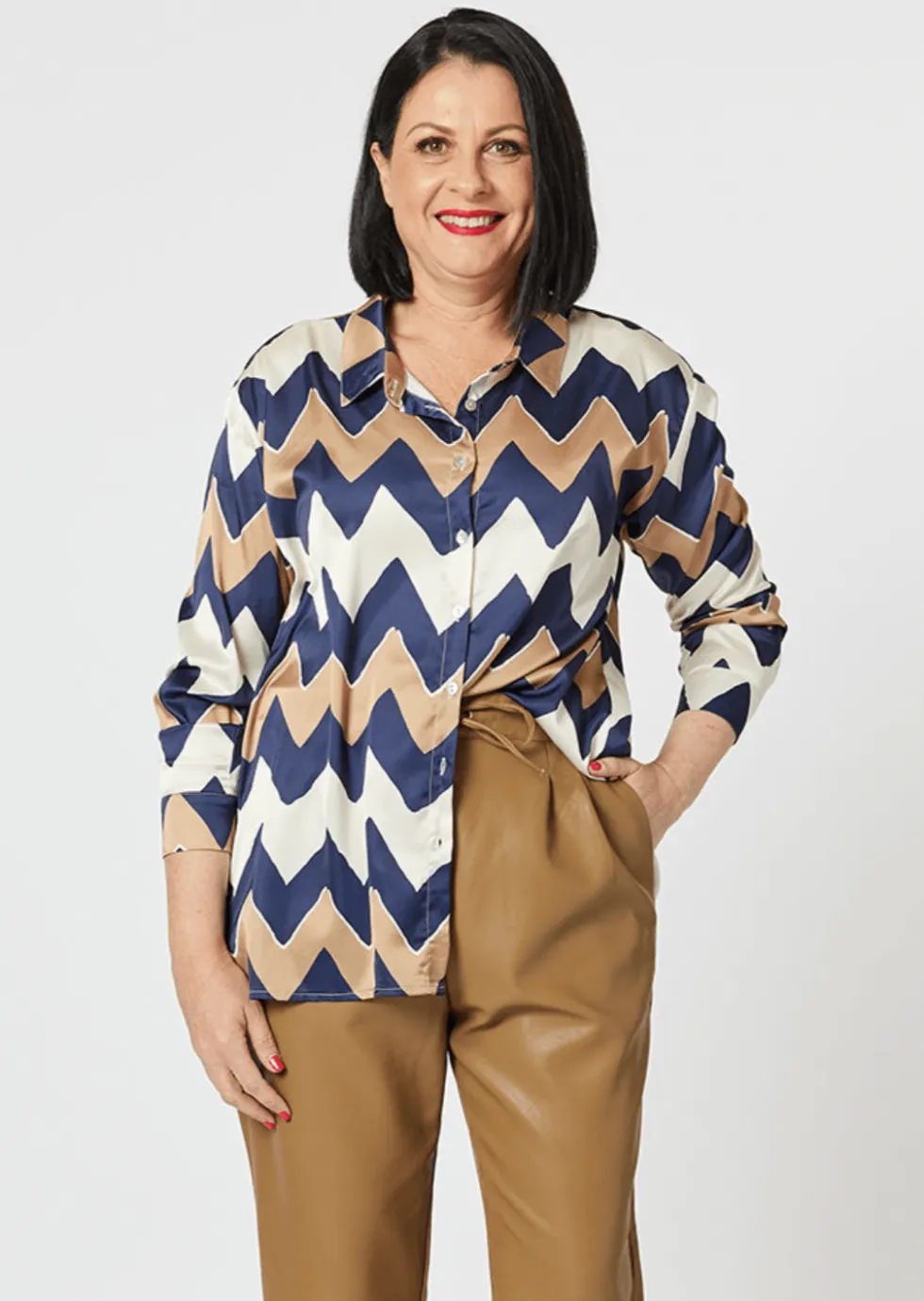 42887 – Bella Print Satin Shirt – ToffeeFeatures: Polyester Soft collar Mother of pearl buttons Button cuff No iron necessary Fit Guide: Long sleeve Long line Button up Relaxed fit