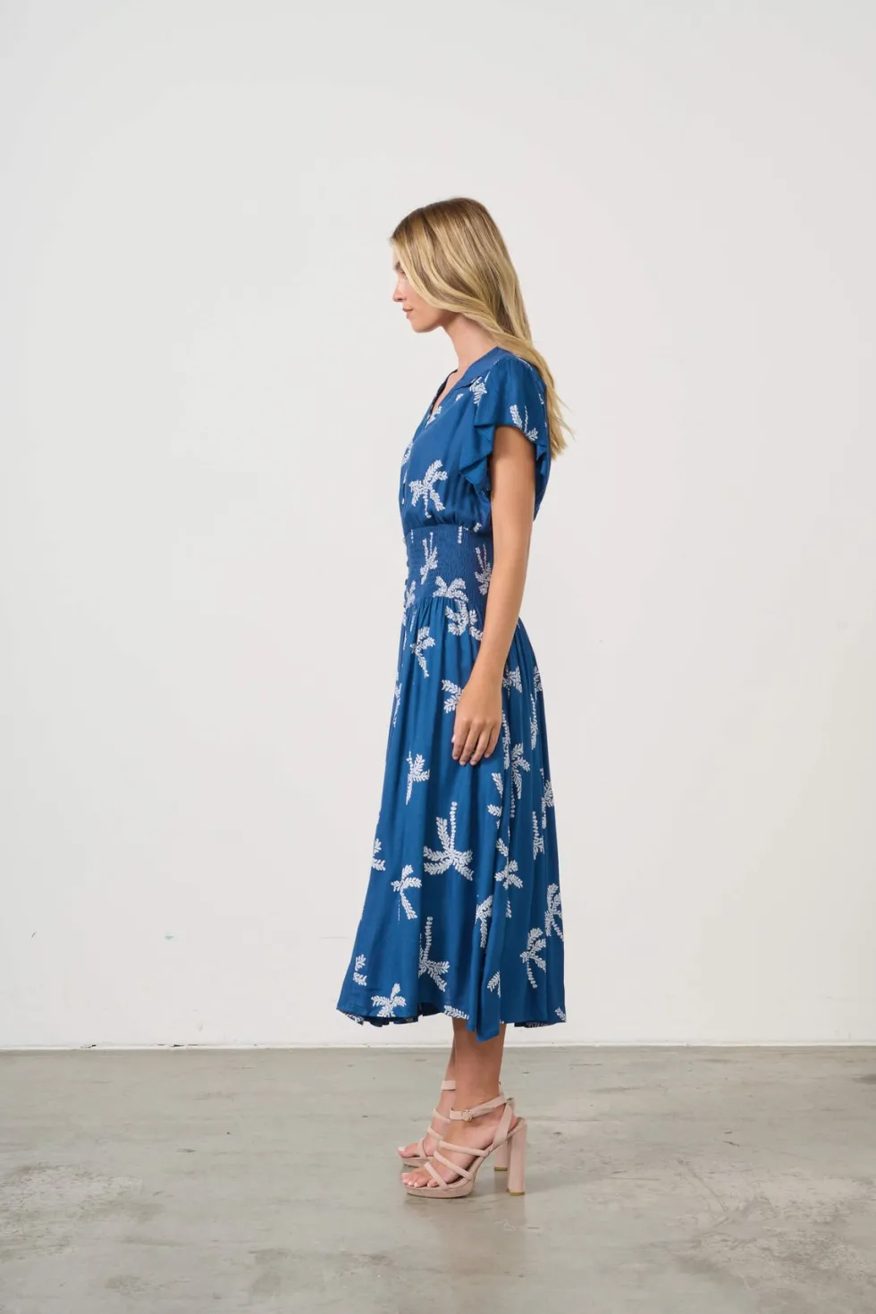Palm Print Shirred Waist Dress HF2667 by Holmes and Fallon at The Wardrobe. Palms Print Special embroidered look print Button through Elastic shirred waist* Feminine ruffle sleeve Front & back special yoke panels Side pockets Relaxed fit Feminine v-neckline Cotton lined No stretch *Please note the waist shirring
