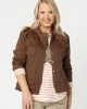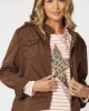 Military Style Denim Jacket – Chocolate 38706 by Threadz at The Wardrobe Quality cotton denim Soft washed look Fringe detailing on the front and back yoke Sparkle trim detail at the epaulettes and down the centre front placket Bronze hardware Nehru style collar with snap fastener Shaped fit Extra stretch for Easy layer