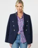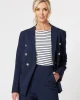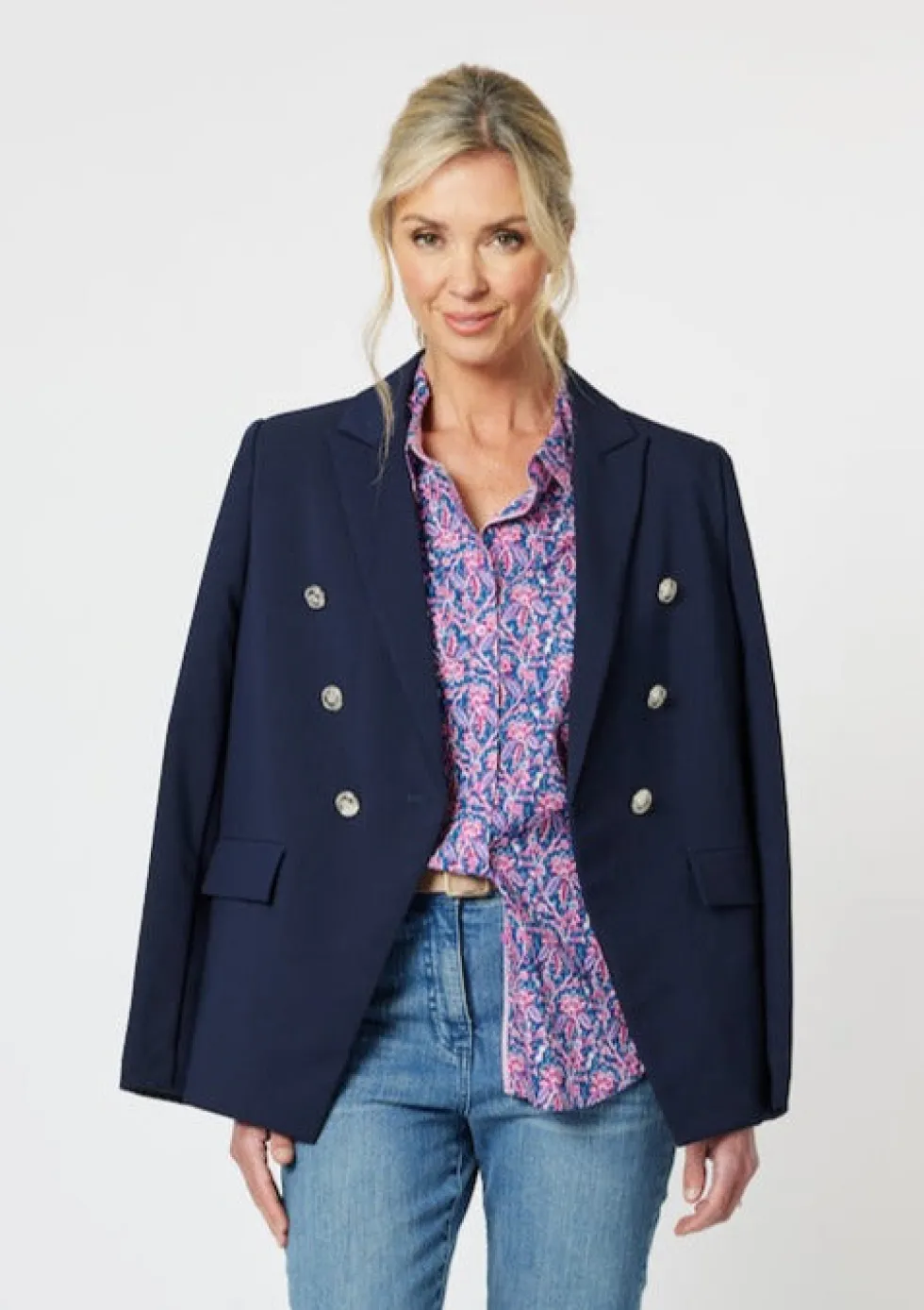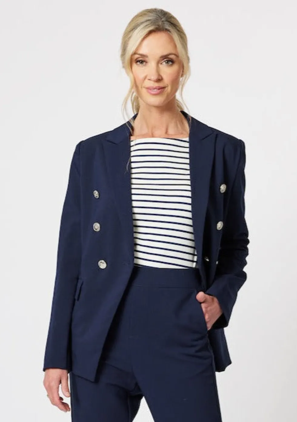 Lauren Blazer – Navy 41862 by Gordon Smith at The Wardrobe. 78% Polyester / 18% Viscose / 4% Elastane Classic blazer Lining through body, not arms, for good range of movement Double breasted Structured shoulder pads Silver crest embossed buttons Welted pockets with flaps Styled in stretch woven fabric Model is 173cm