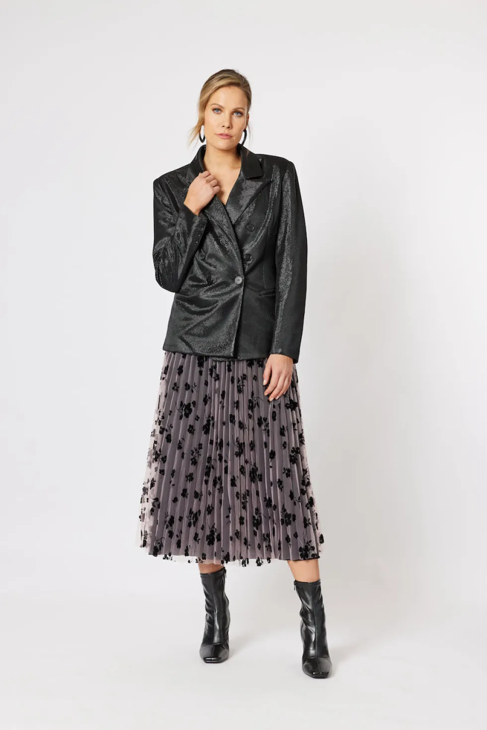 100%Polyester Subtle shimmery finish Welt pockets Shoulder pads Model wears size 8/XS and stands 175cm tall.