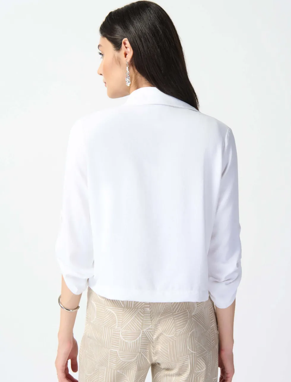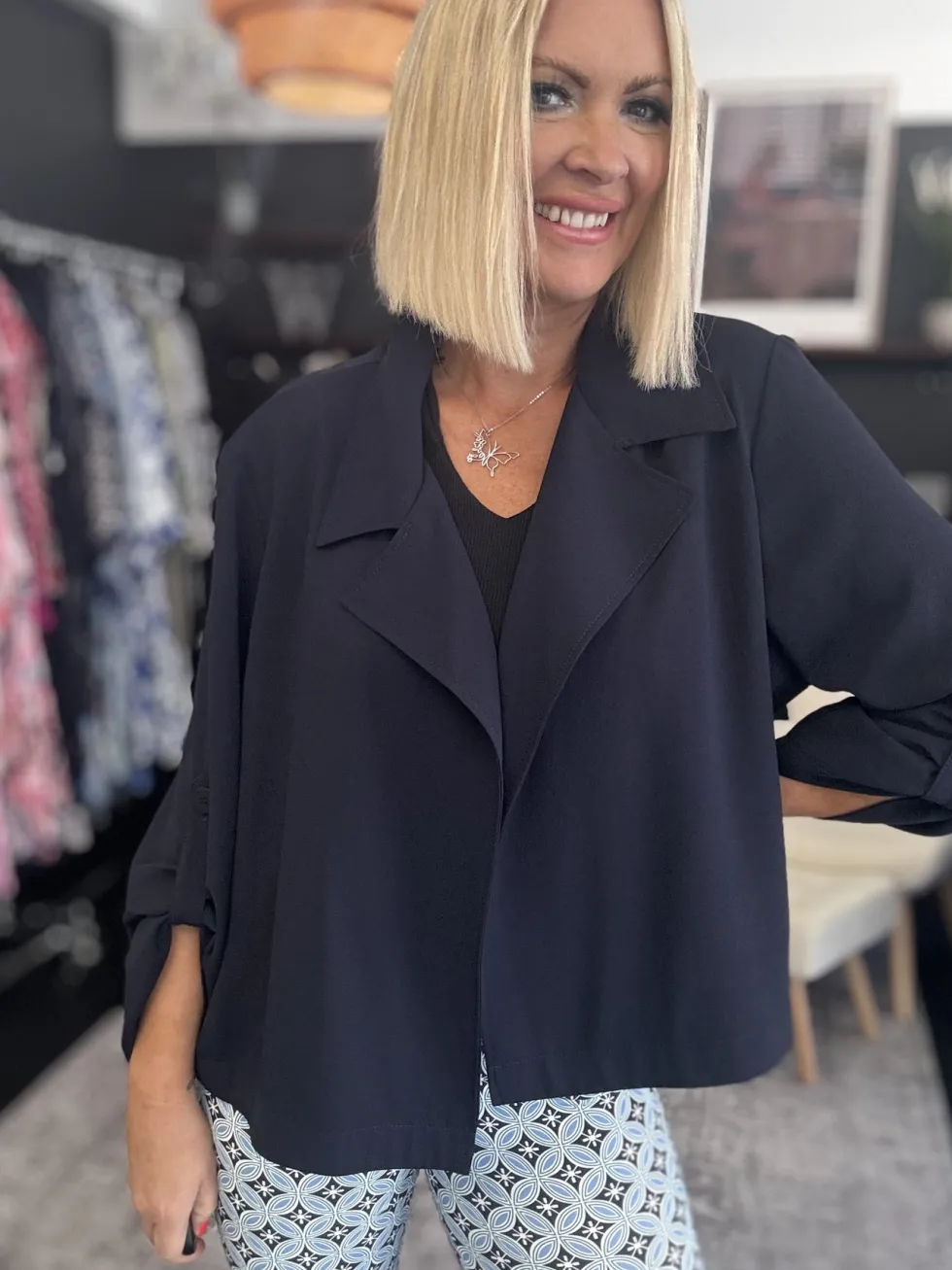 Casablanca Woven Boxy Cover Up -Midnight Blue 242059 by Joseph Ribkoff at The Wardrobe This is a sale item and is only eligible to return for a store credit or exchange. Also available in white Create a polished look for any occasion with this exquisite woven cover up. This garment is tailored in a short boxy silho