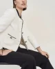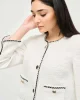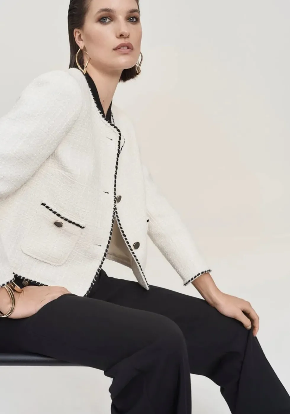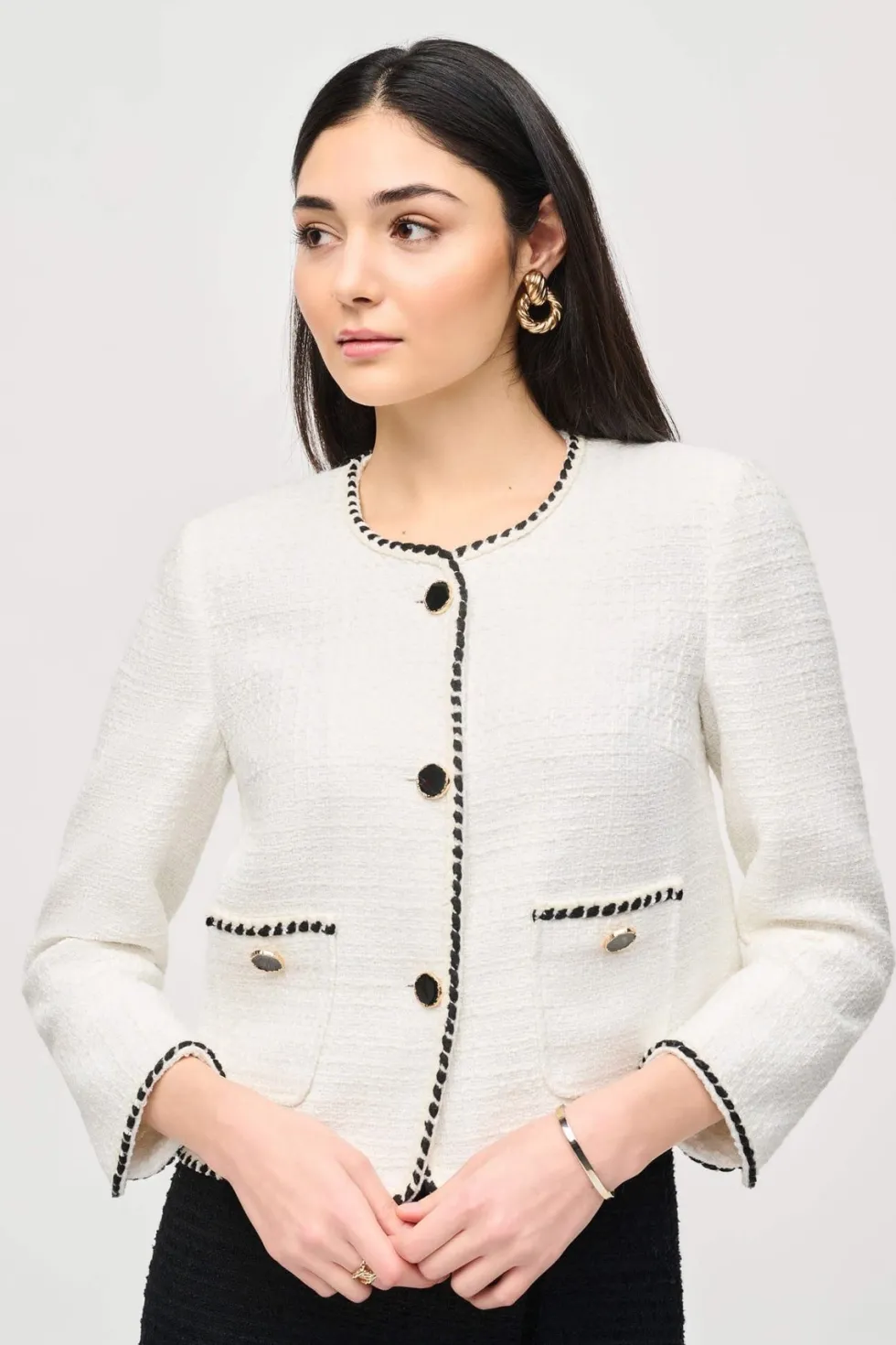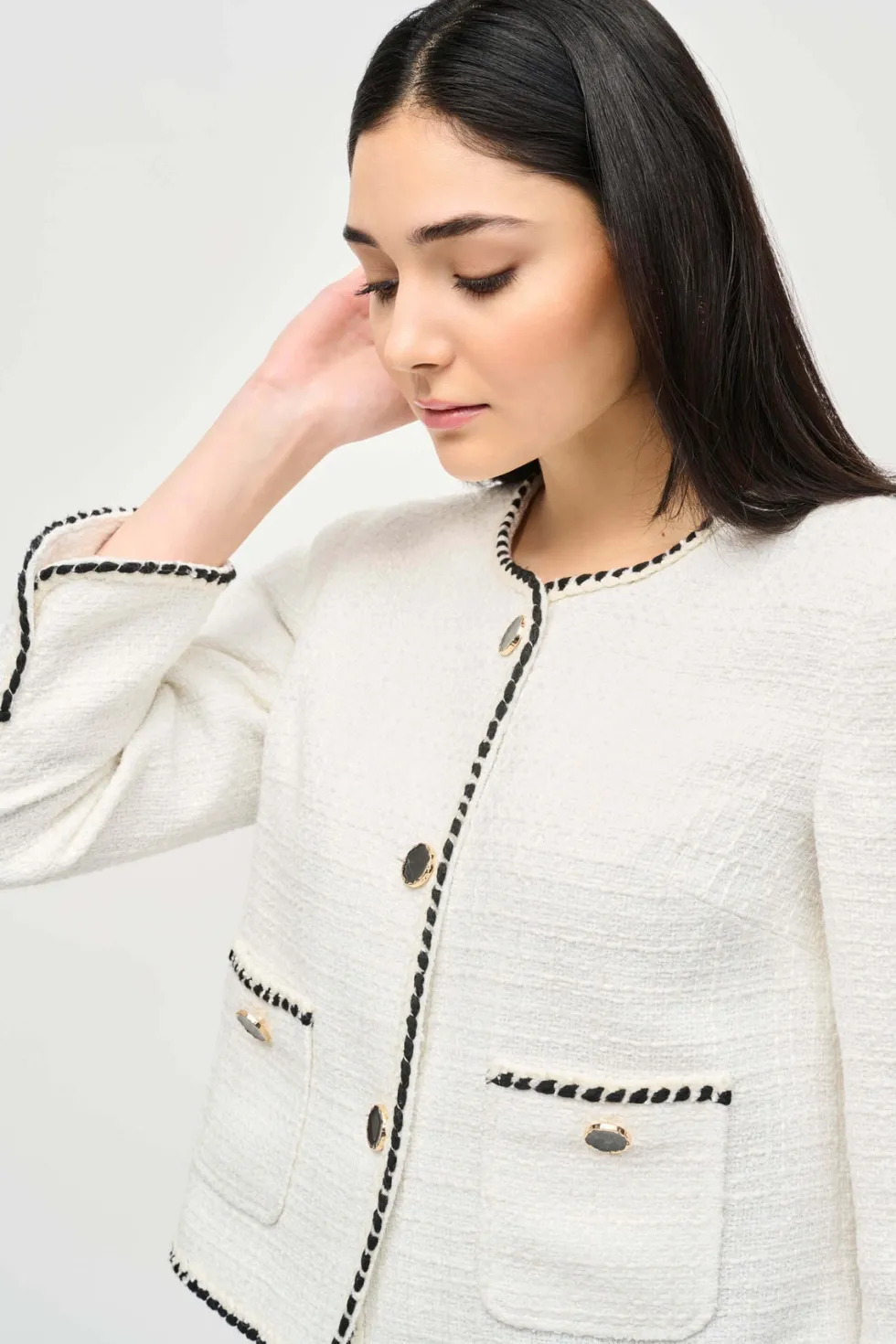 Queen of Scots Bouclé Jacket With Contrast – Cream 243911 by Joseph Ribkoff at The Wardrobe. This is a sale item and is only eligible to return for a store credit or exchange. This bouclé jacket is the perfect piece for adding texture and structure to an outfit. With a contrast trim, faux chest pockets, and a front bu