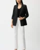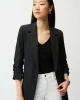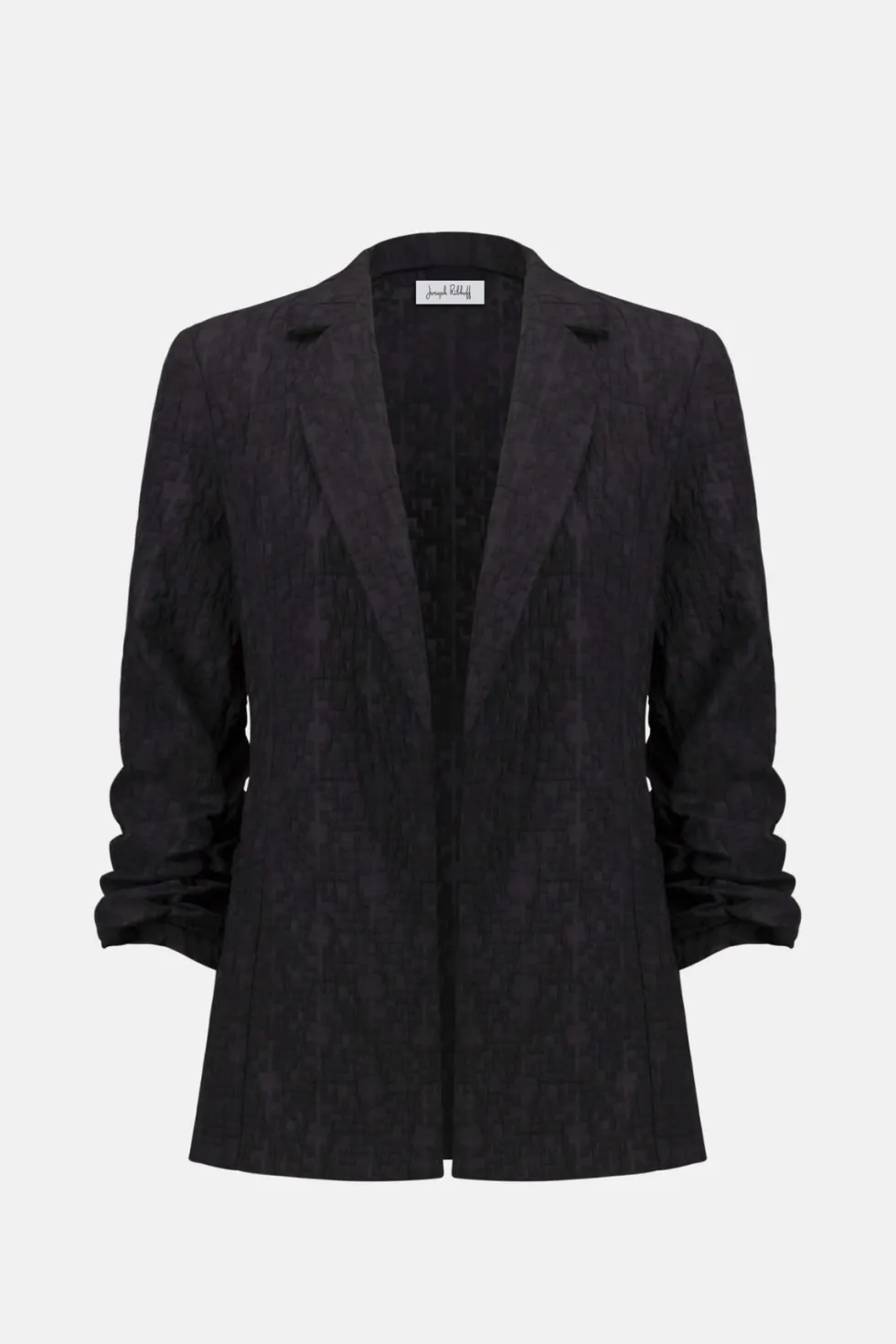 Santa Cruz Woven Jacquard Texture Boxy Blazer242034S26 – Black By Joseph Ribkoff at The Wardrobe. This is a carry over style. A boxy silhouette lends a bold appeal to a wardrobe favourite. Tailored from a stunning jacquard fabric, this solid blazer features a notched collar and shirred three-quarter sleeves, both coor