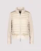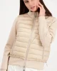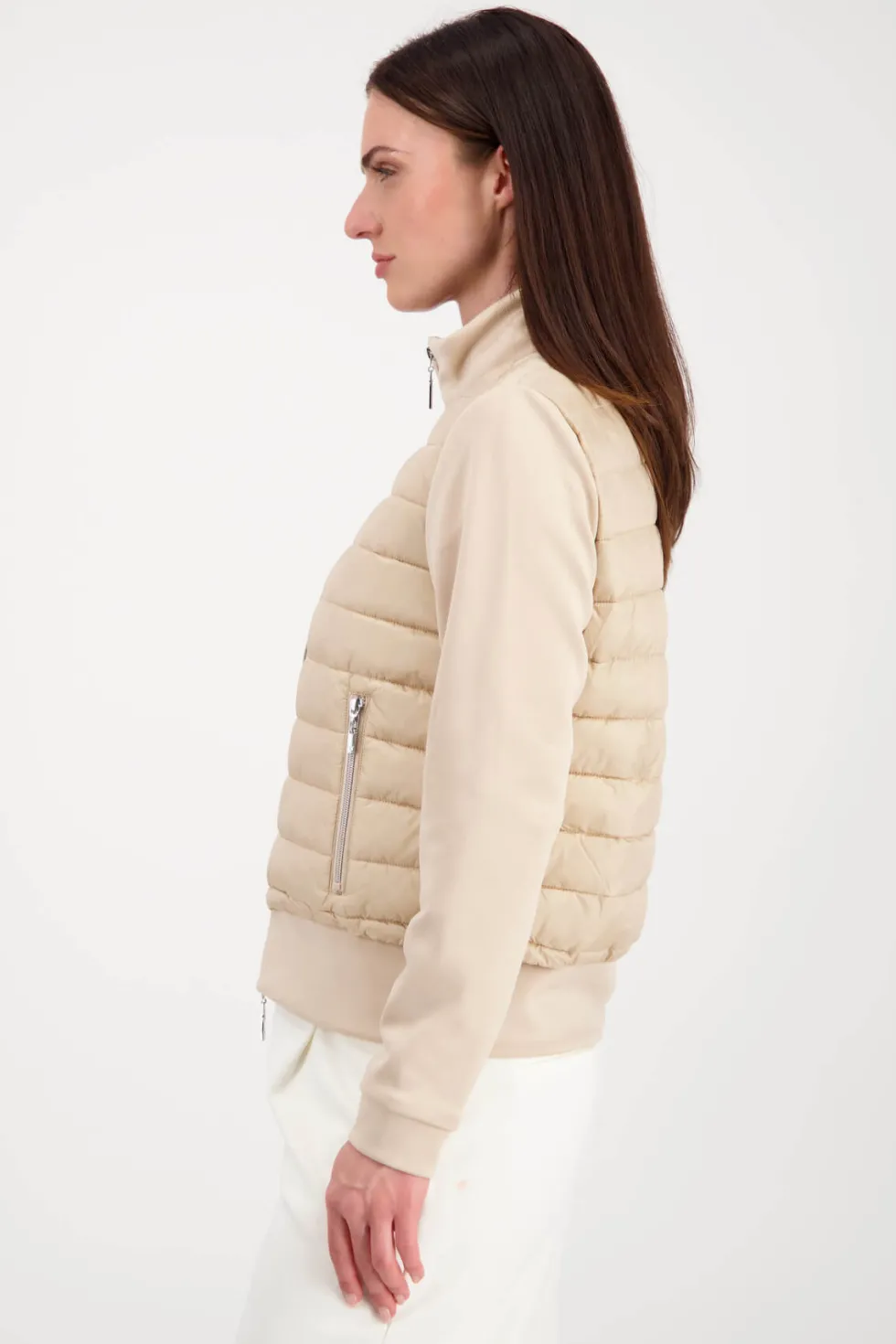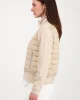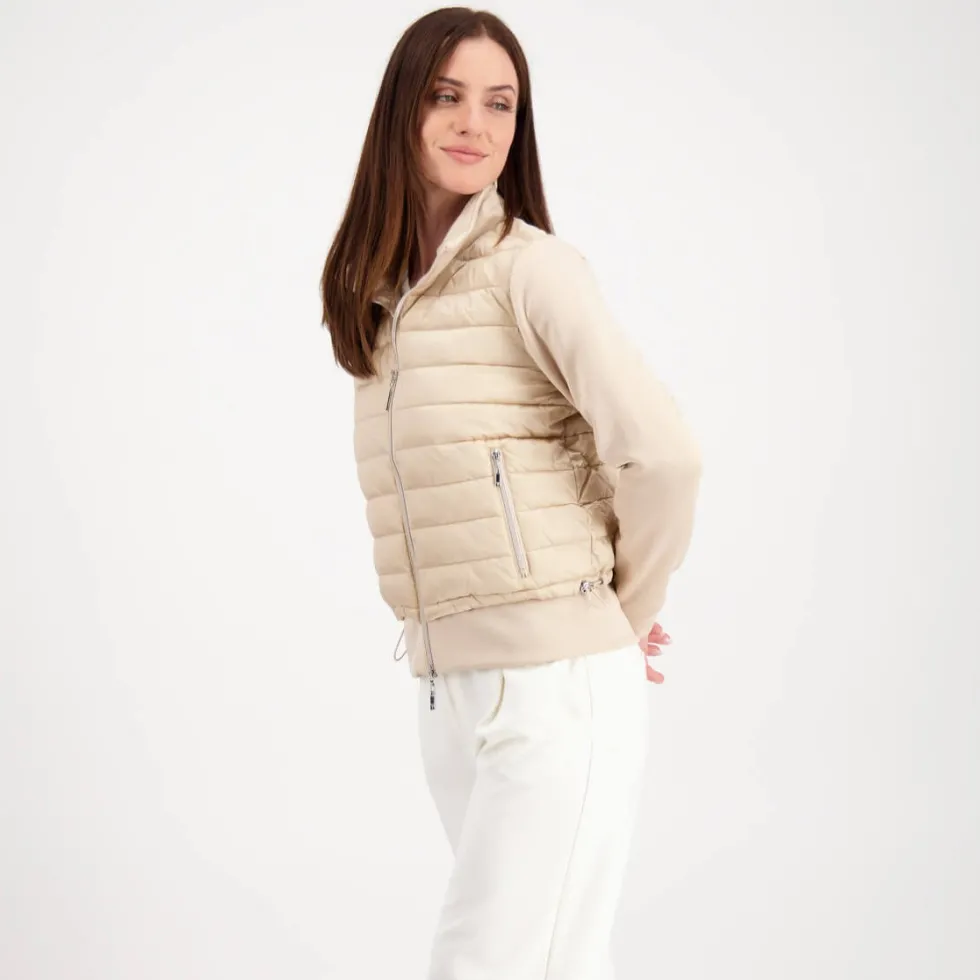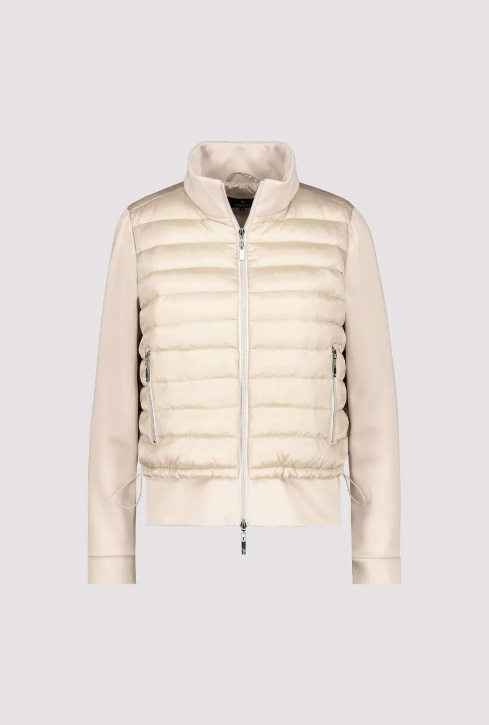 Quilted Neoprene Jacket -Biscuit 807294 by Monari at The Wardrobe 100% polyamide; 92% polyester; 8% elastane; 100% polyester This comfortable material mix jacket is both ultralight and warming. Its long sleeves, stand-up collar and attached hem are made of an elegant neoprene fabric, while its body has a quilted finish