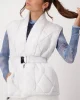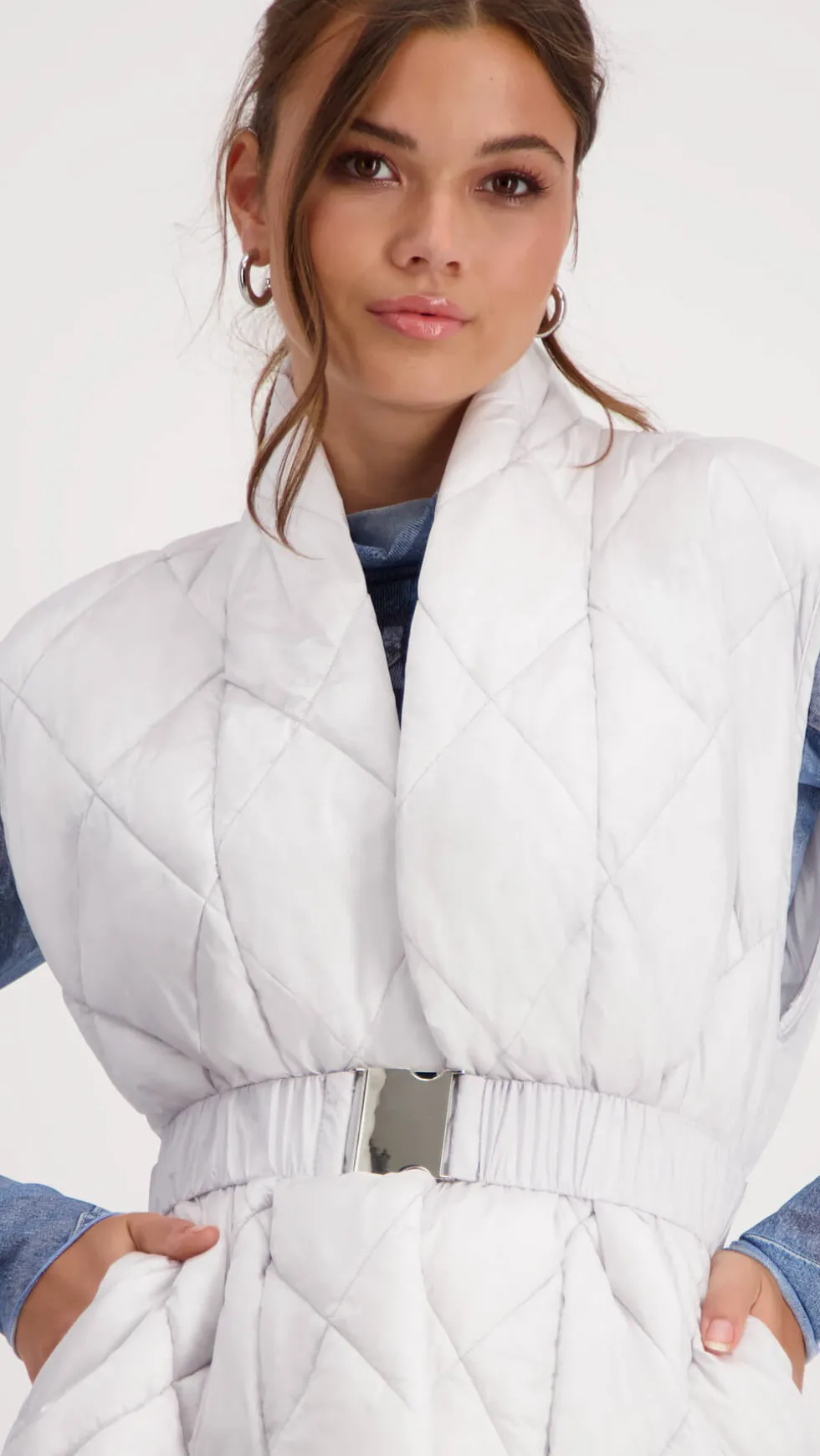 Shawl Collar Waistcoat – Cloudy Grey 408177 by Monari at The Wardrobe. 100% polyamide; 100% polyester The shiny quilted gilet features a shawl collar. In addition, an elastic waist belt with buckle ensures a perfect fit.