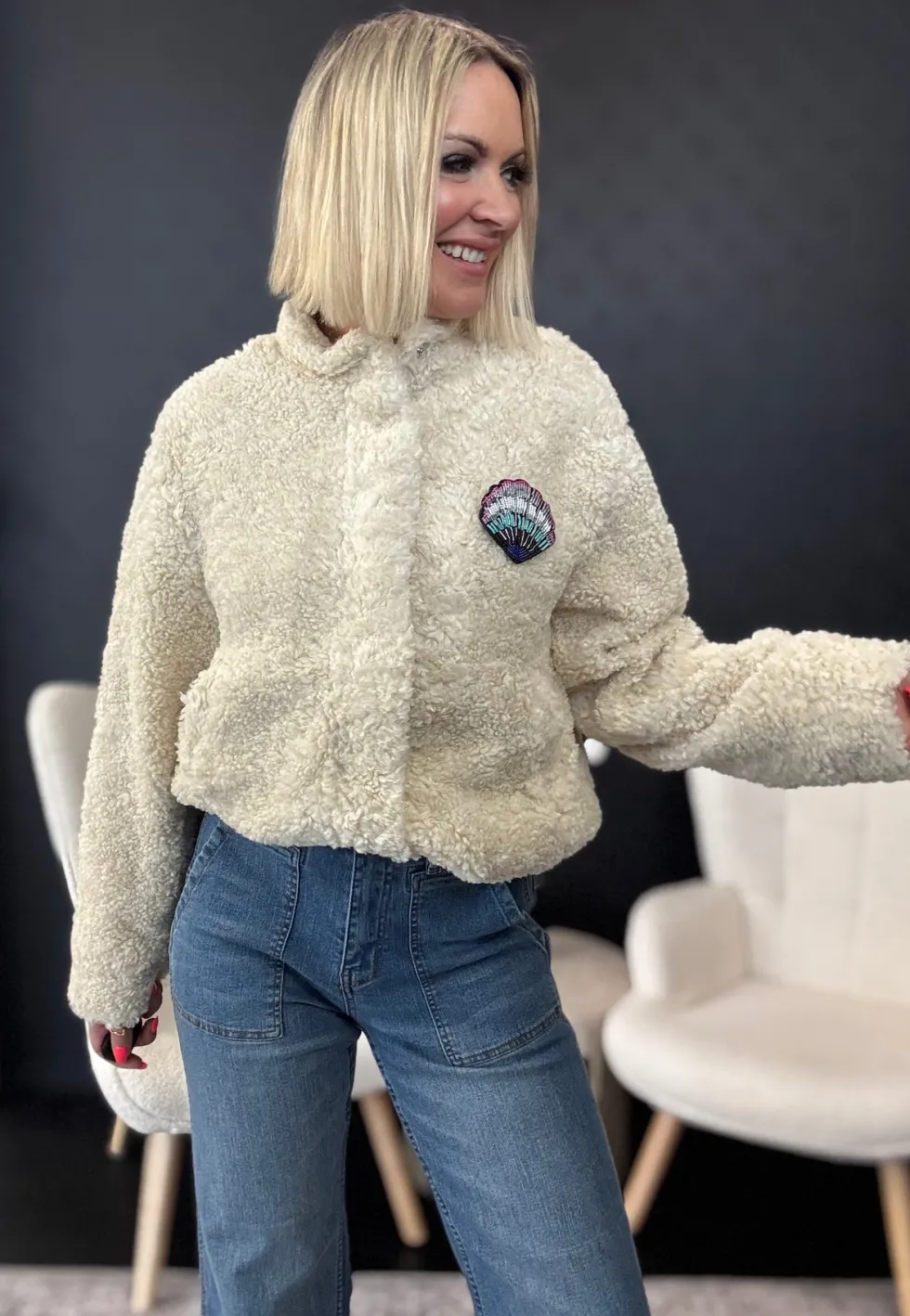 Teddy Ecru Jacket 8013 POM Amsterdam at The Wardrobe. 100% Polyester This ecru teddy jacket is perfect for autumn. The jacket is wonderfully soft and comfortable thanks to its teddy fabric. The jacket has a beautiful detachable brooch in the shape of a shell. • Off-white jacket