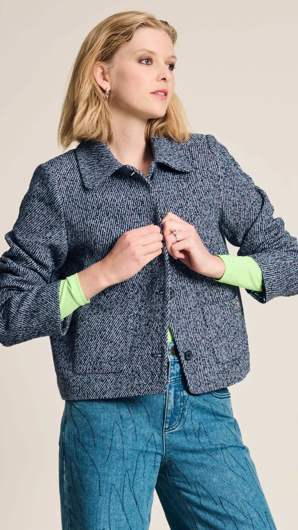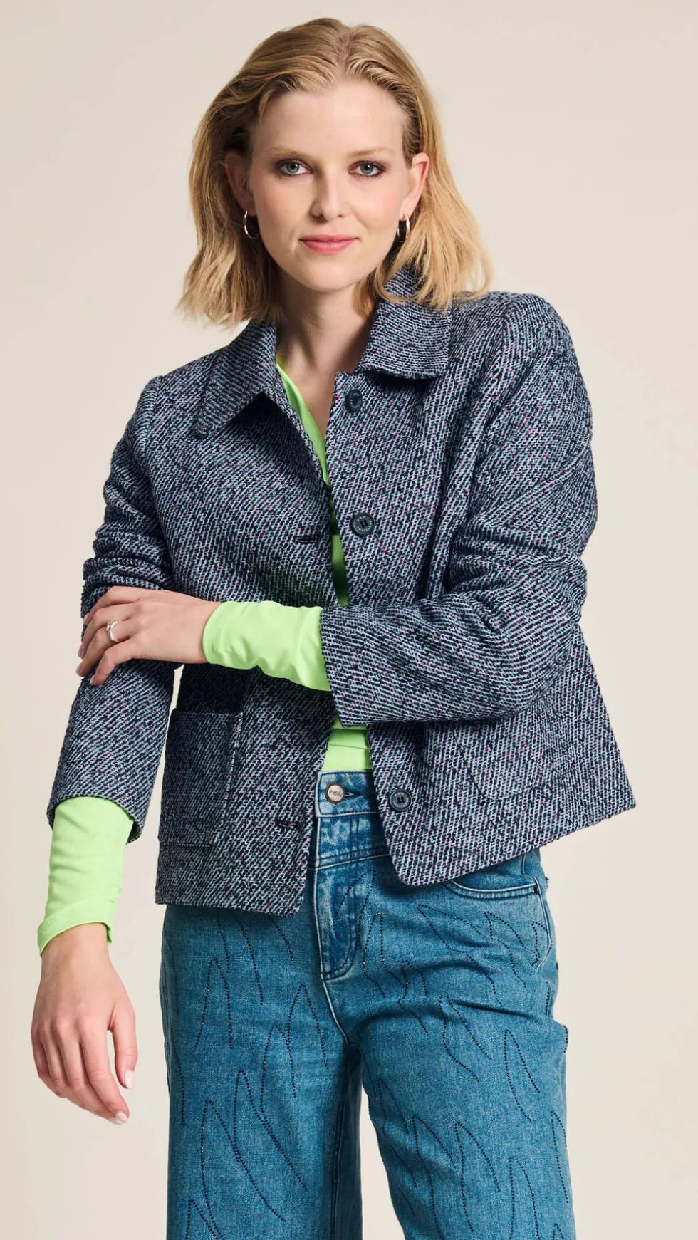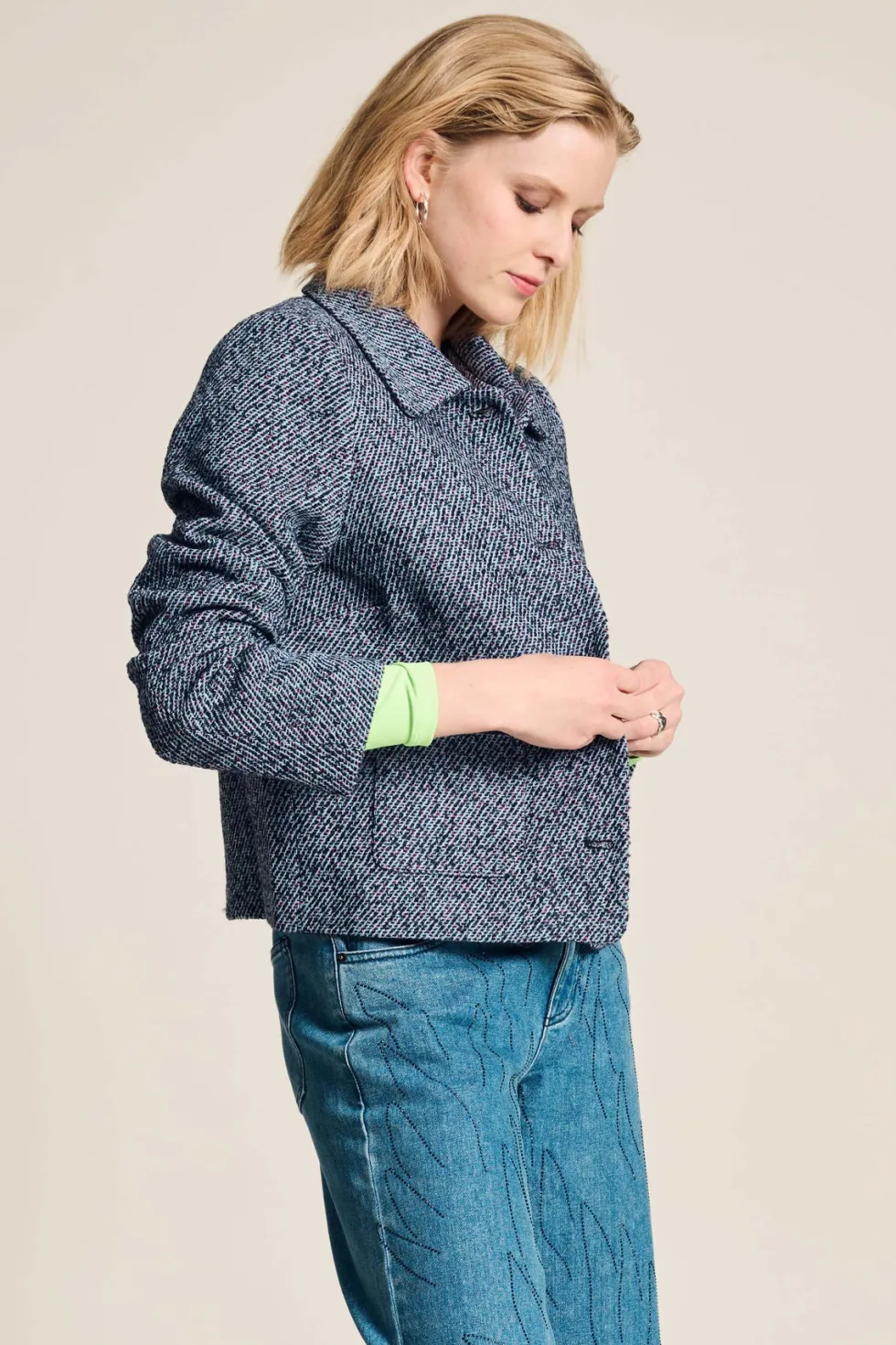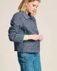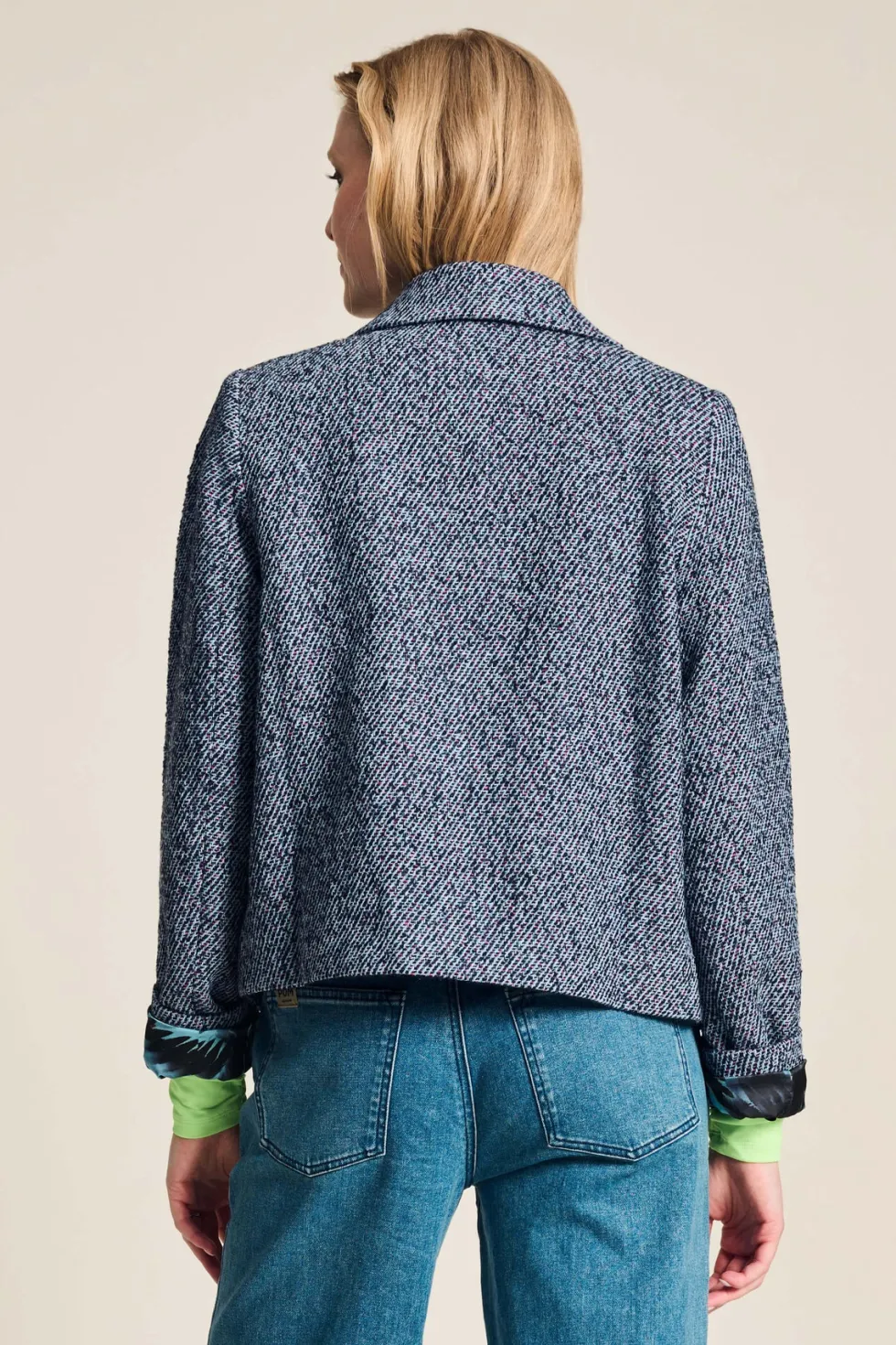 Tweed Blue Jacket Pom8015 by Pom Amsterdam at The Wardrobe Discover our blue tweed jacket, the perfect combination of sophistication and comfort. With its fine texture and luxurious look, this is the perfect jacket for autumn. • Blue jacket• Pink and black woven tweed fabric• Textured fabric• Short fi