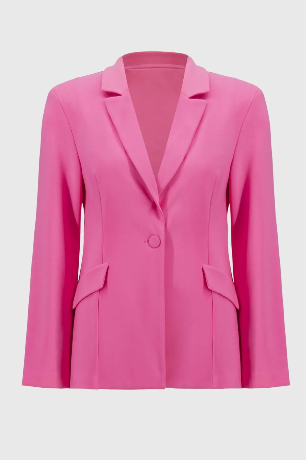 Palm Canyon Straight Blazer – Bubblegum Pink 251240 by Joseph Ribkoff at The Wardrobe. Expertly tailored with darting at the front and back, this classic silky knit blazer offers a professional look with a perfect straight fit. Details like a notched collar, matching front button, and faux-pocket flaps raise this piece