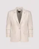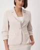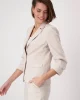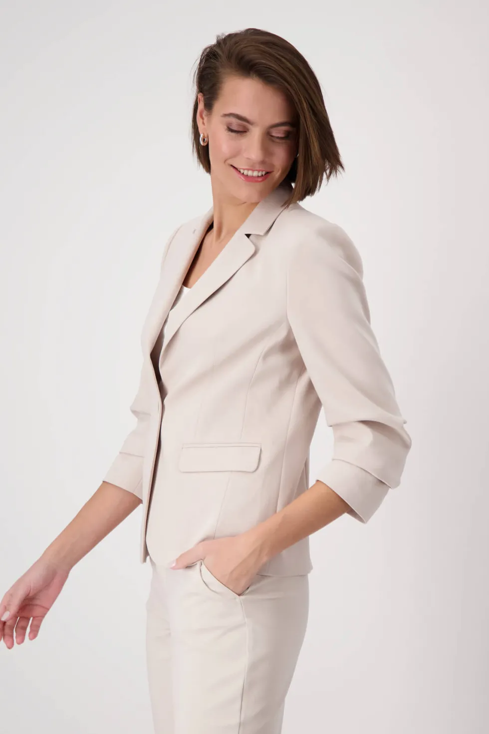 Pleated Sleeve Blazer – Warm Sand 409060 by Monari at The Wardrobe. High-quality cotton blend Stretchy material Crimped sleeves Lapel collar Regular fit ¾ sleeves Button placket Fake flap pockets Longer at the front The model is 1.79 m tall and wears size 36. The back length of size 38 is 62 cm and the front length is