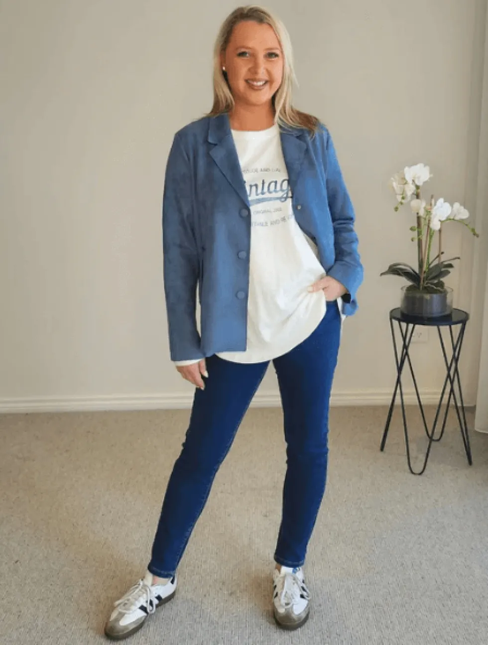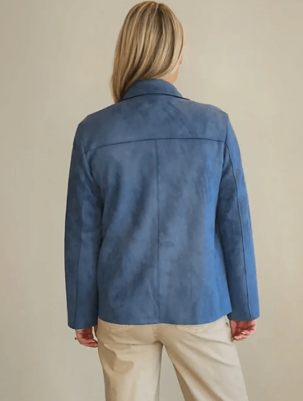 TH46668 – Avenue Faux Suede Jacket – Indigo from THREADZ at The Wardrobe Unleash your bold and stylish side with this gorgeous Avenue Faux Suede Jacket. Made of luxuriously soft suede-like fabric, it adds a burst of colour to any ensemble. Its captivating design and comfortable fit make it a must-have in your wardrob