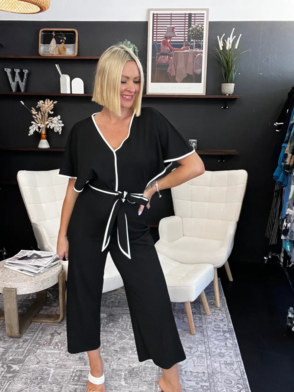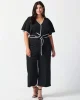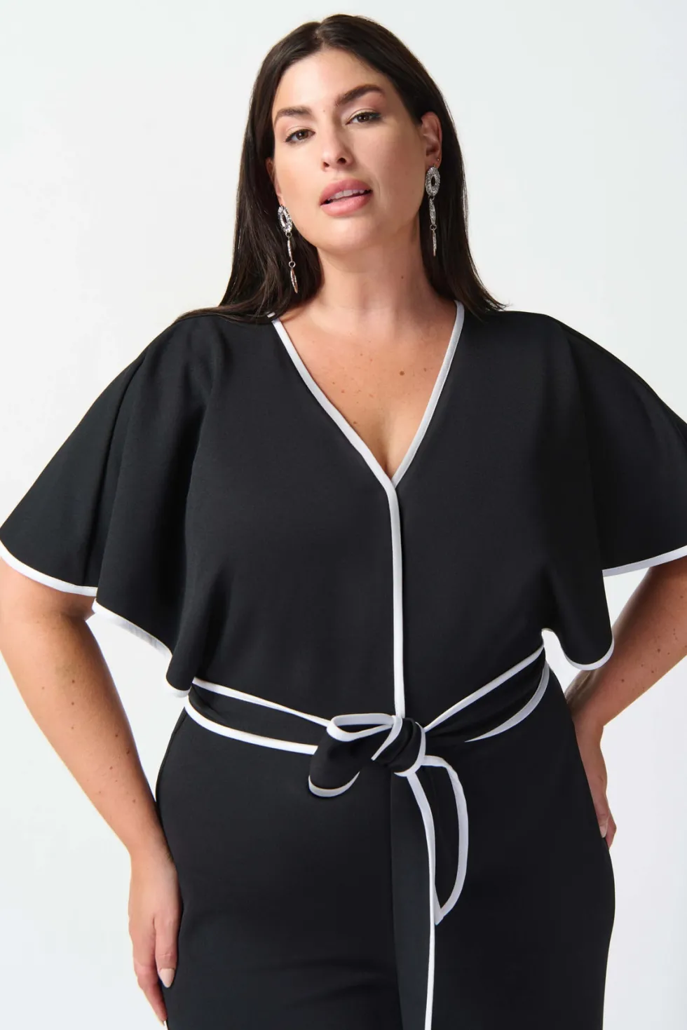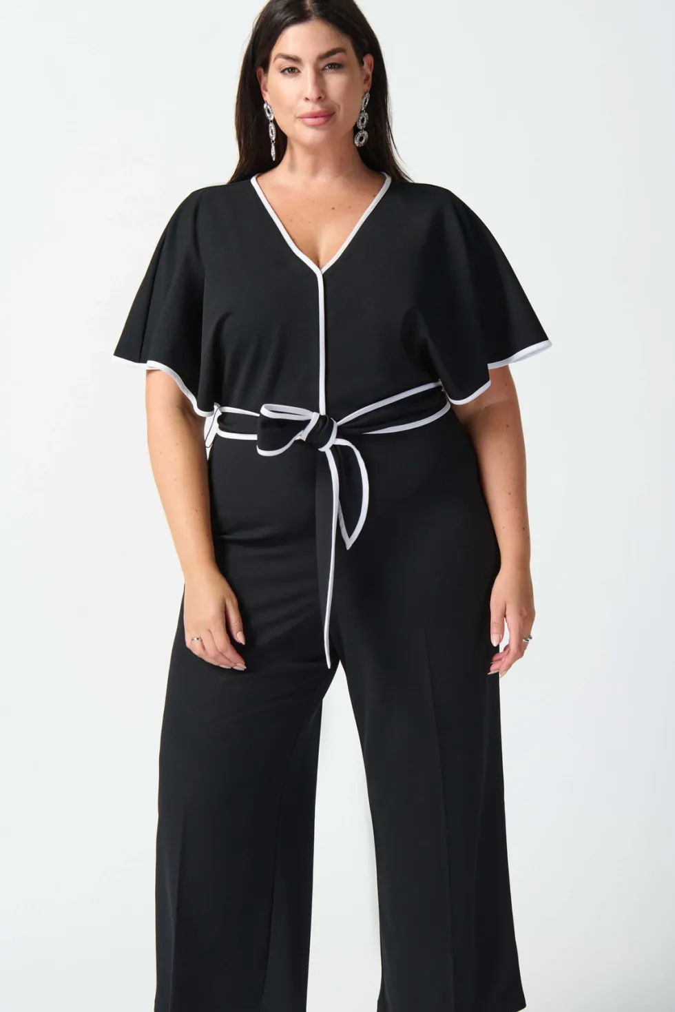 Casablanca Scuba Crepe Belted Jumpsuit – Black/Vanilla 242082 by Joseph Ribkoff at The Wardrobe This is a sale item and is only eligible to return for a store credit or exchange. 95% Polyester, 5% Spandex Scuba crepe and georgette V neck Short butterfly sleeves Belt Unlined Hand wash in cold water with like colors Do n