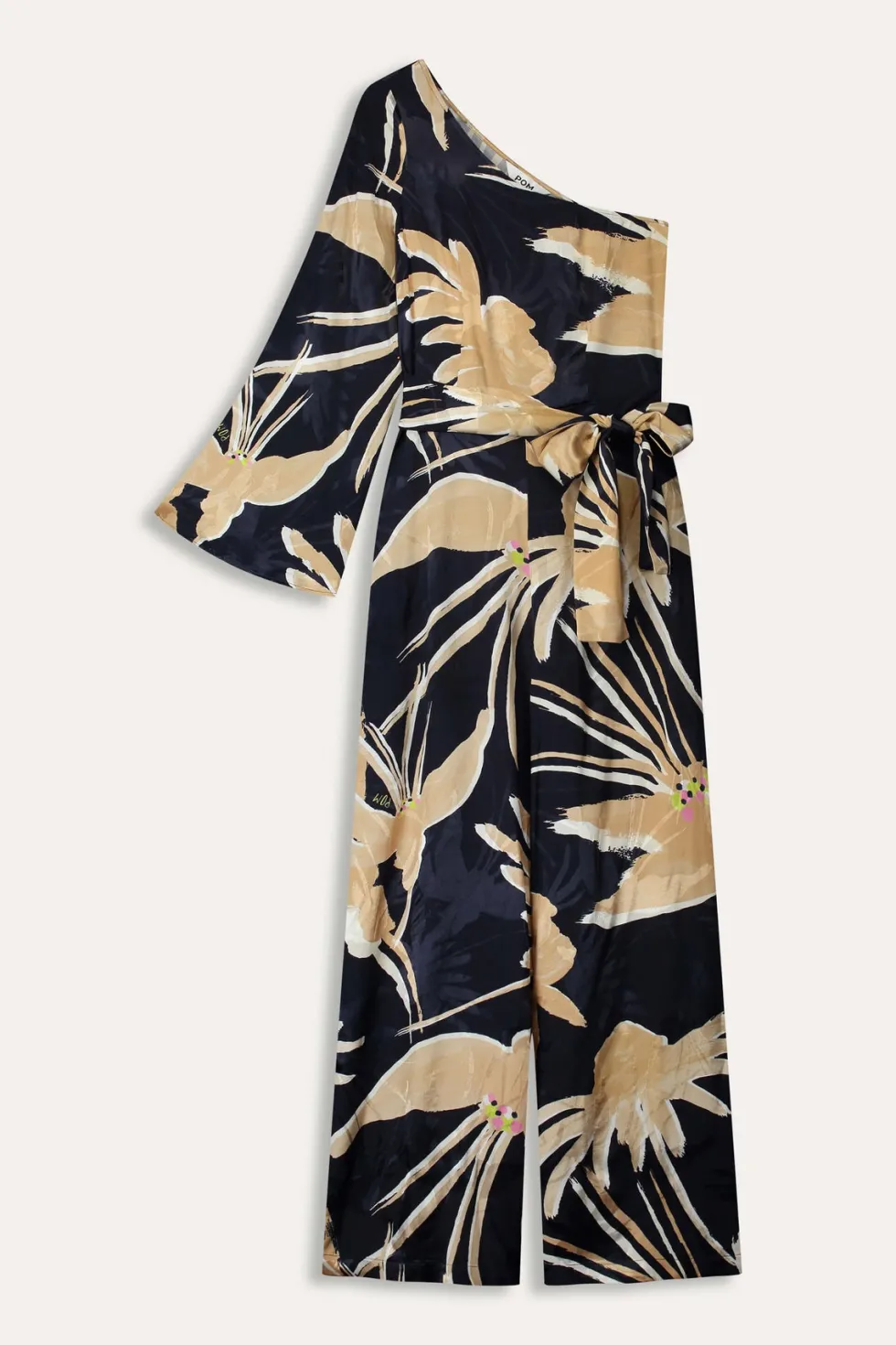 One Shoulder Artisan Jumpsuit – Sand 9181 by POM Amsterdam at The Wardrobe. This beautiful blue jumpsuit features a one shoulder design and a bow belt at the waist. The jumpsuit is made from 37% Lenzing™ Ecovero™ viscose, making it a 'more sustainable' choice. 65% Viscose 35% Lenzing Ecovero Viscose Cool machine wash a