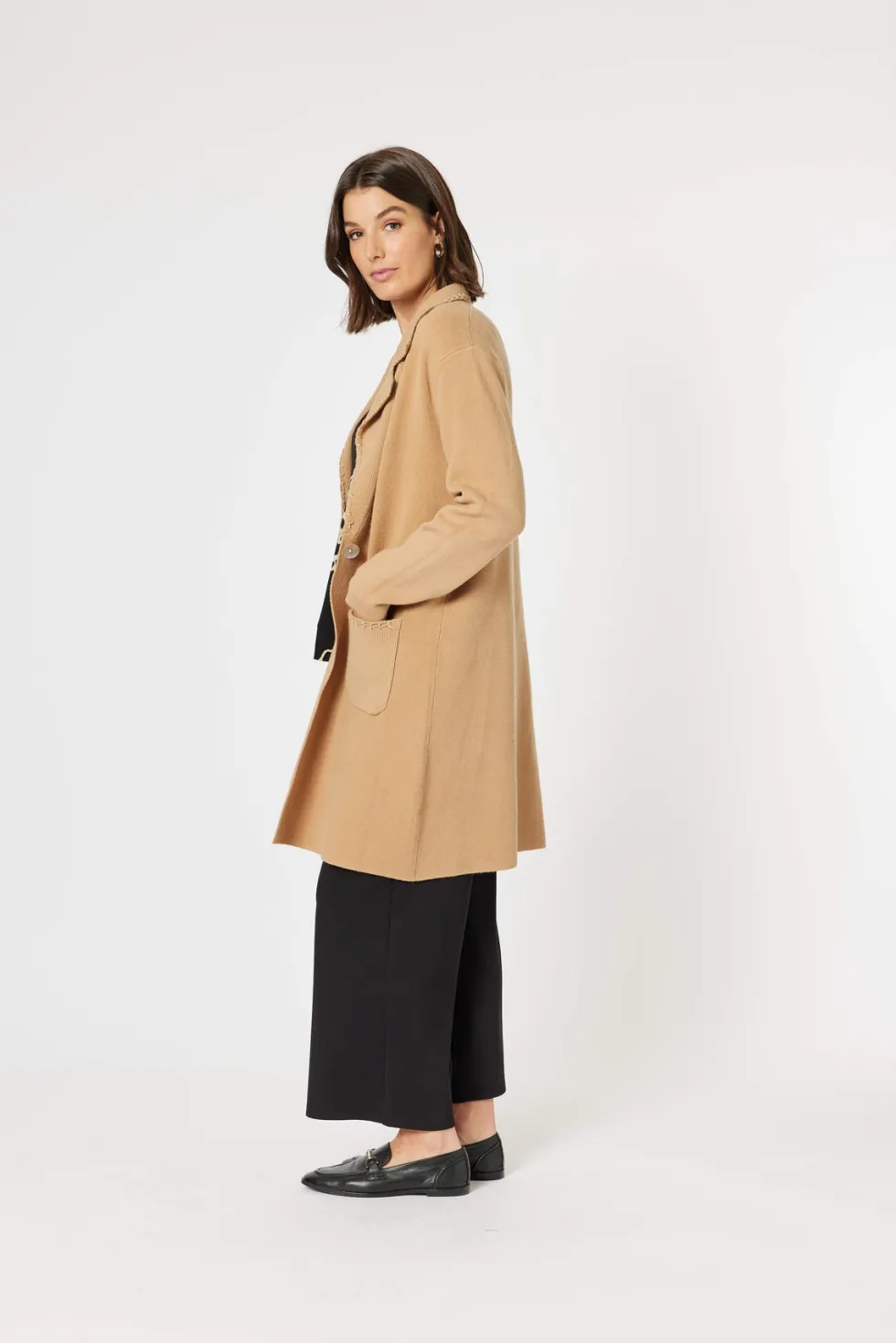 Cosy Cardigan – Caramel 46608 by Clarity at The Wardrobe. Experience the best of both worlds with this hybrid piece that combines the warmth of a coat and the comfort of a cardigan. With its unique stitch detailing and practical patch pocket, this stylish piece is sure to be a staple in your wardrobe. The single button