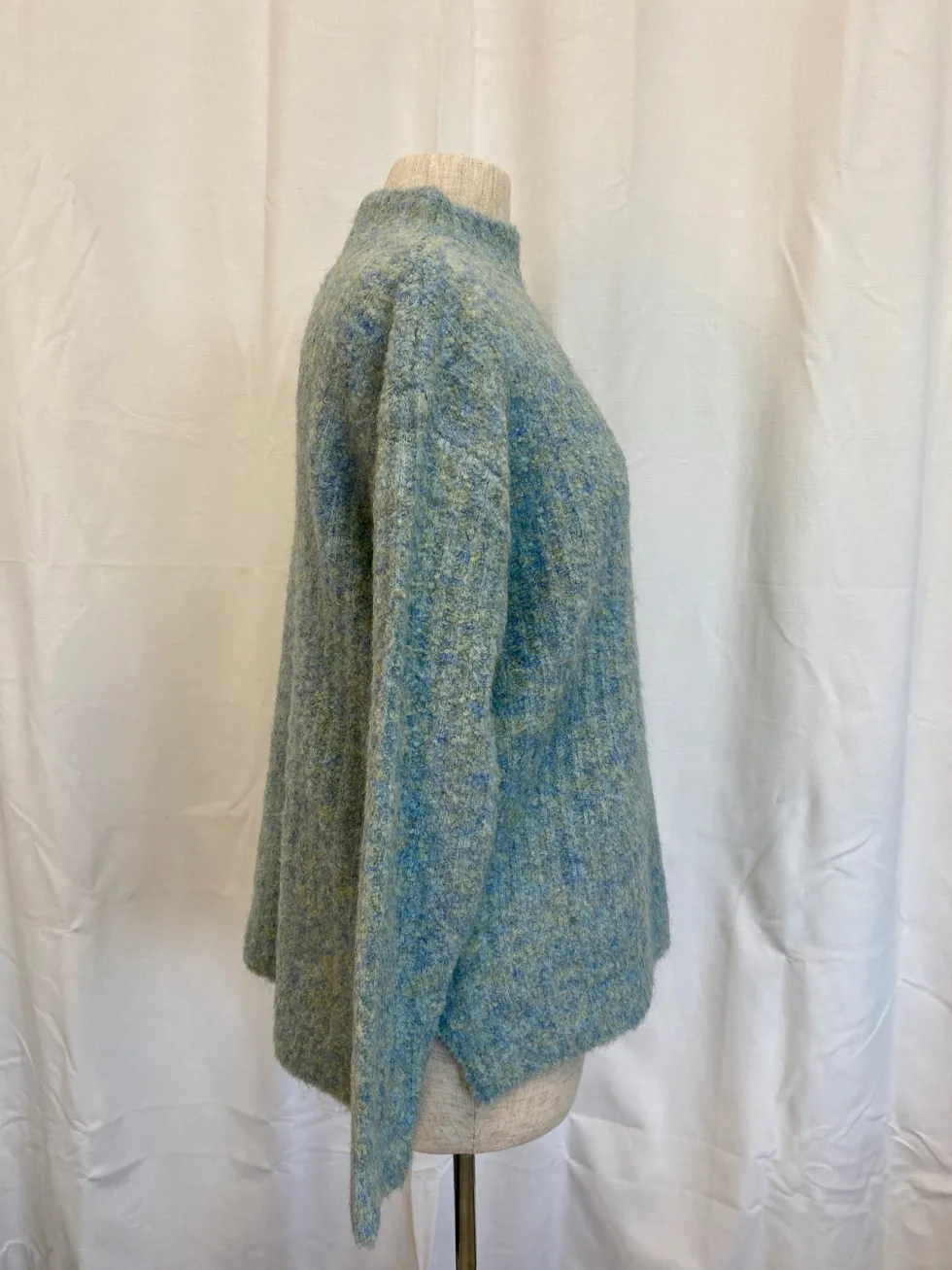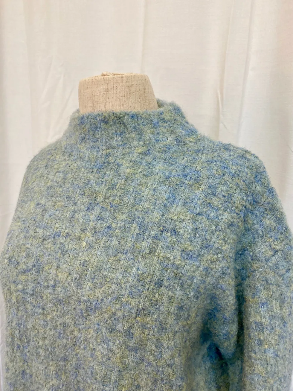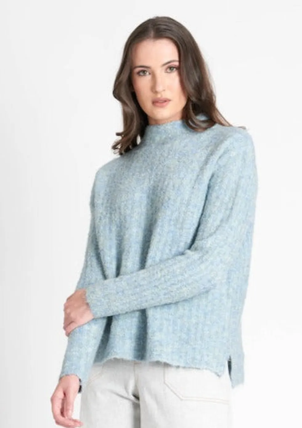 Rib & Roll Sweater – Menthol Blue by FOIL at The Wardrobe 52% Recycled polyester, 18% Acrylic, 18% Nylon, 10% wool, 2% Elastane