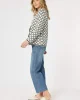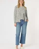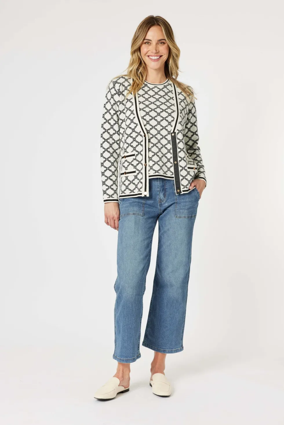 The Clover Print Knit Cardigan 46611 by Gordon Smith at The Wardrobe features a unique, stylish pattern. The Clover Top also available. Accented with gold buttons and faux pockets, adding a touch of sophistication to any outfit. The stripe detail on the hem and cuffs adds visual interest and complements the design beau