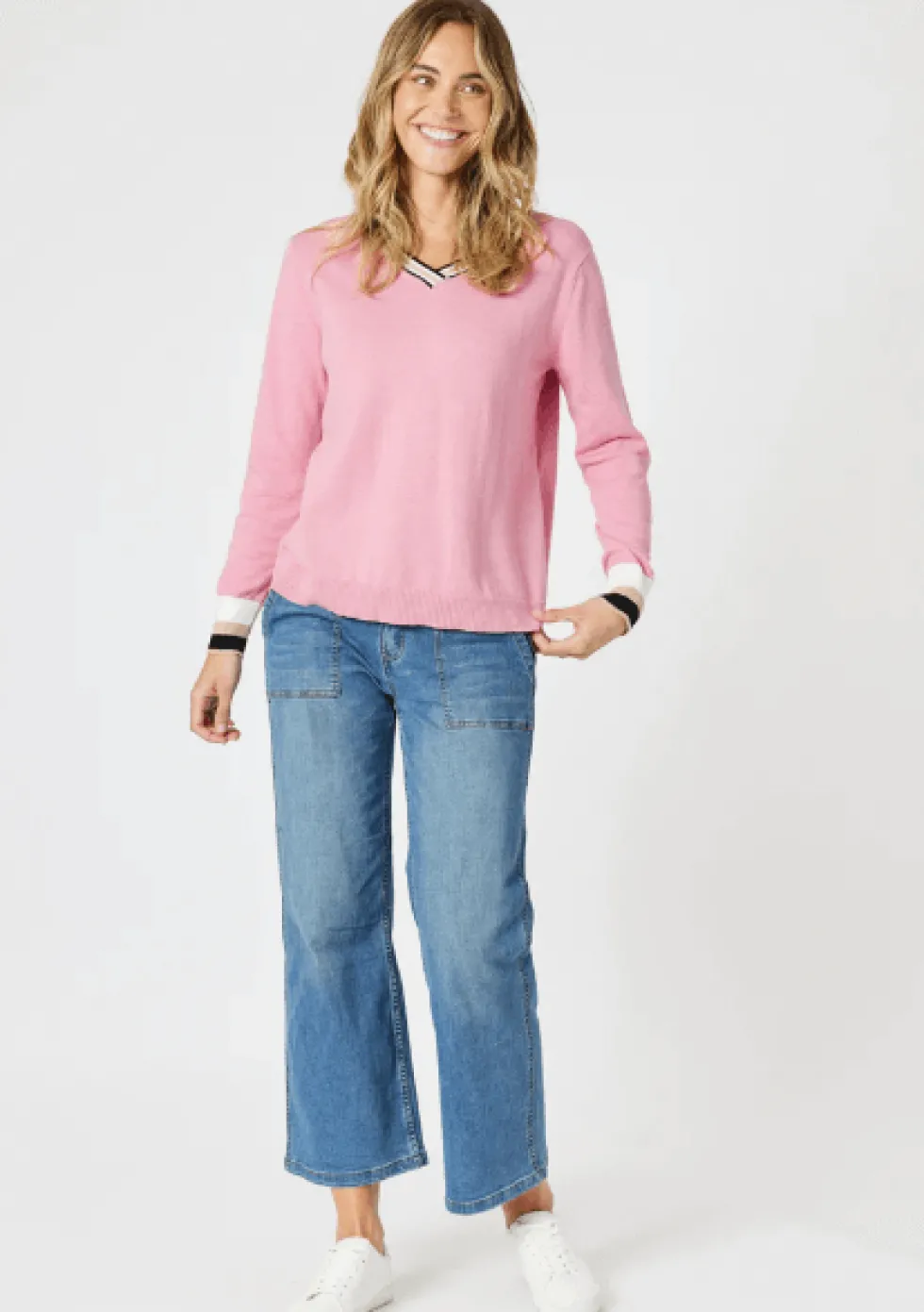 Harvard Jumper – Blush46647 Gordon Smith at The Wardrobe. Our Harvard V Neck Jumper will soon become a staple piece in your wardrobe. With its classic v neck and long sleeve design, it's perfect for any occasion. Stylish stripe cuffs and neckline provide a touch of sophistication. Cotton/Nylon/Wool Sits on hip.