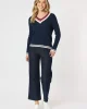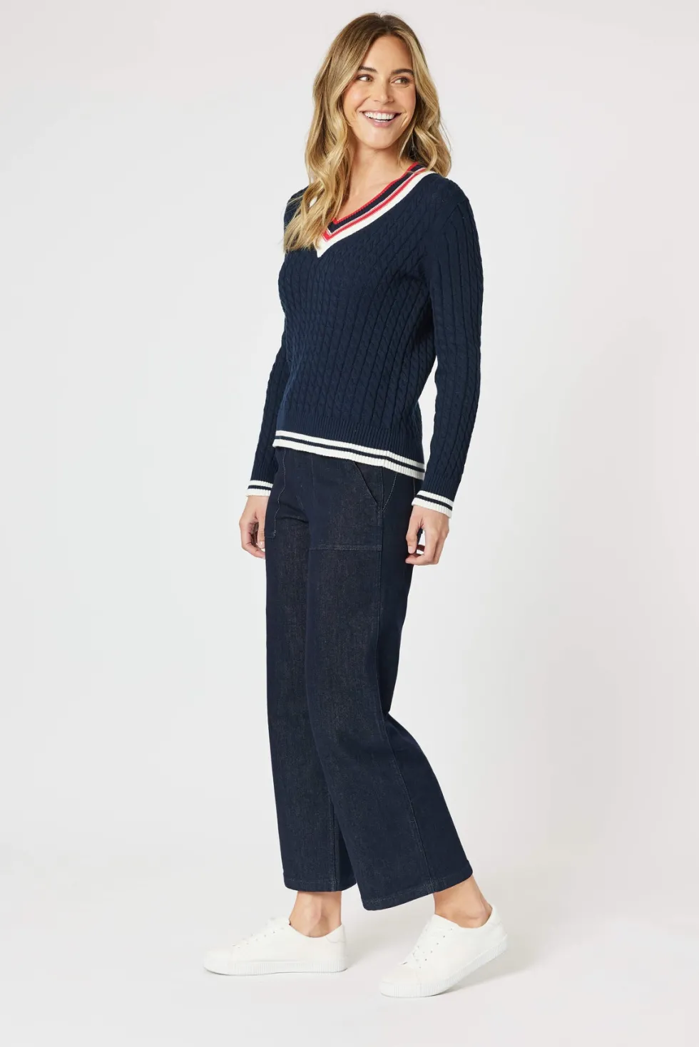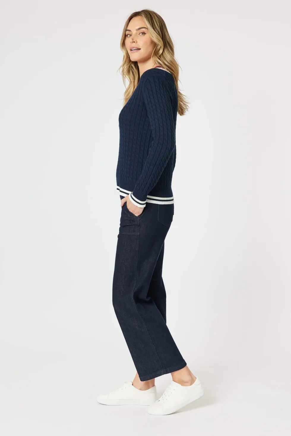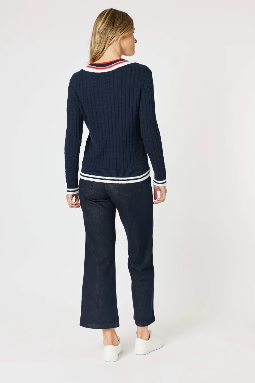 Oxford Cable Knit Jumper – Navy 46623 by Gordon Smith at The Wardrobe Crafted with a classic cable knit design and a flattering v-neck silhouette, our Oxford Cable Knit Jumper is a must-have for colder weather. The stripe design on the hem and neckline add a touch of style to this cosy jumper. Stay warm and stylish wit