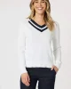 The Princeton Knit by Gordon Smith at The Wardrobe is crafted from 100% Cotton and is the upgrade to the college knit we all needed. The contrasting colour detail on the V Neck line is stunning and is something to "Fan Girl" over, the workmanship in this knit is outstanding. We are ready for "Sweater Weather" and the P