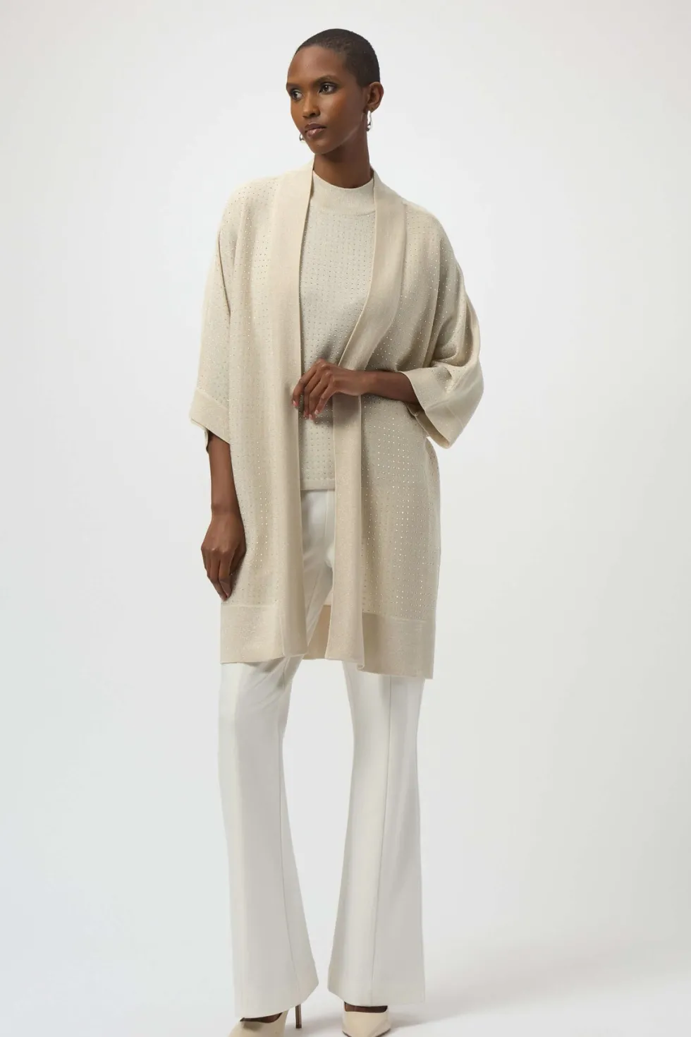 Sweater Knit Cover Up – Birch 254937 by Joseph Ribkoff at The Wardrobe. Crafted from soft sweater knit, this elegant cover-up receives a glamorous touch with shimmering iron-on detailing at the front. Its longline, open-front design and straight silhouette create a graceful, flowing look perfect for any occasion. 21% M