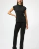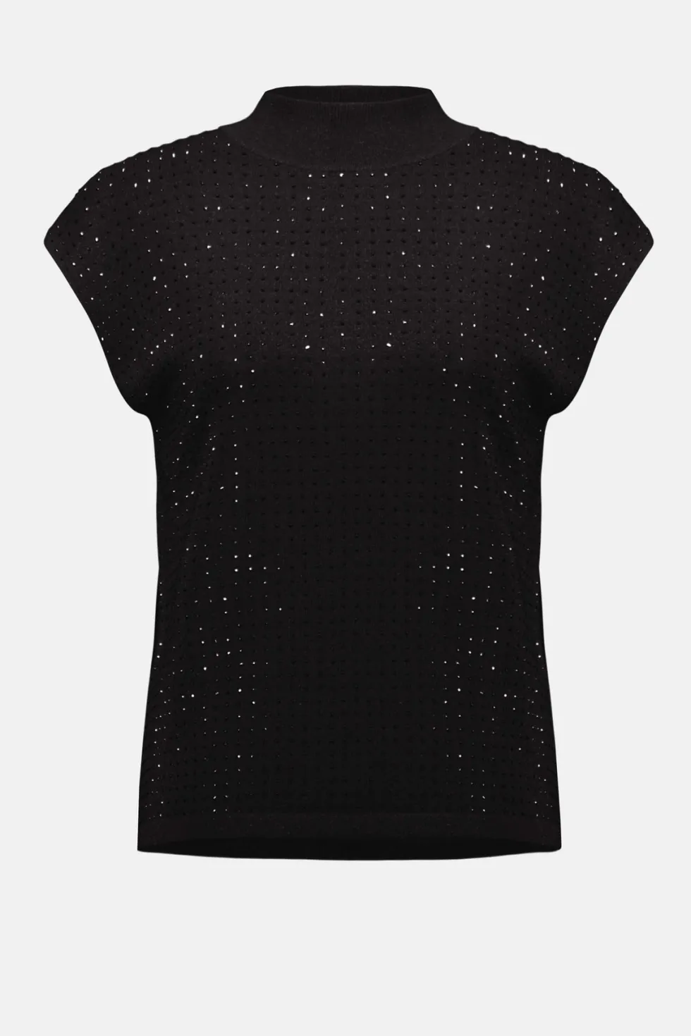 Sweater Sleeveless Knit – Black 254935 by Joseph Ribkoff at The Wardrobe. This versatile sleeveless pullover is a chic addition to your occasion wardrobe, featuring a sophisticated mock neck and elegant iron-on detailing. Crafted from a soft sweater knit in a flattering straight fit, it pairs beautifully with a variet