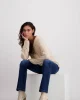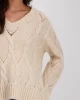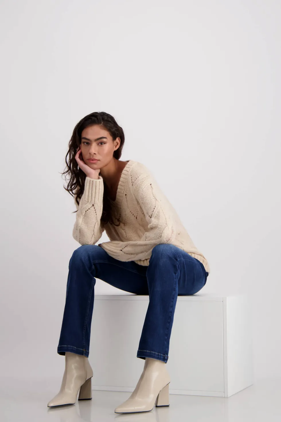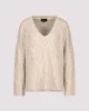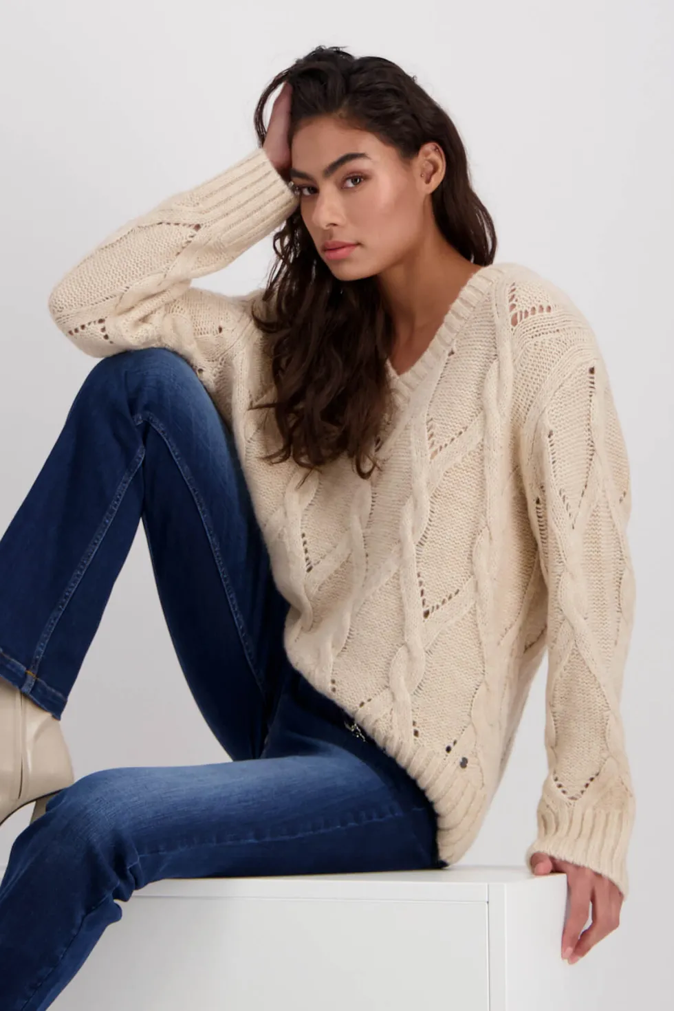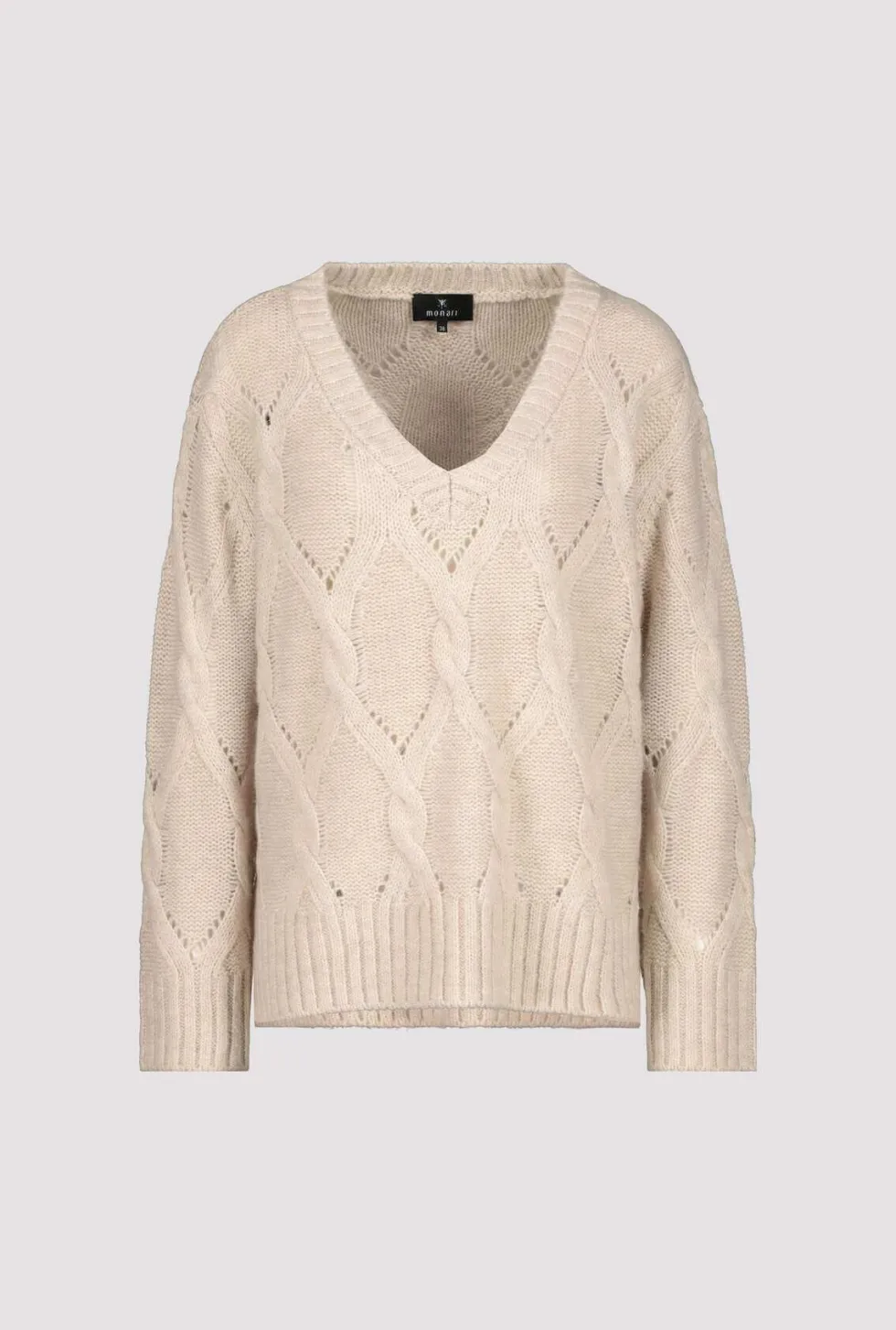 Braid Fleece Sweater – Biscuit 807225 by Monari at The Wardrobe. 58% acrylic; 30% polyester; 12% wool This fluffy pullover has a feminine design due to the cable stitch pattern with gaps. Its soft poly-acrylic blend makes it comfortable to wear. Soft poly-acrylic blend; Fleece yarn; Cable stitch pattern with gaps; Regu