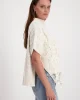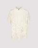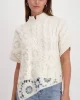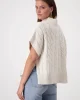 Sand Shell Stand Up Pullover – Sand 808136 by Monari at The Wardrobe. 65% polyester; 27% acrylic; 8% wool; 60% cotton; 40% acrylic High-quality cotton; Cable stitch pattern; Wool-blend lace with sequins. Oversized; Stand-up collar with slit; Short sleeves; Side slits; Longer at the back This jumper impresses with its