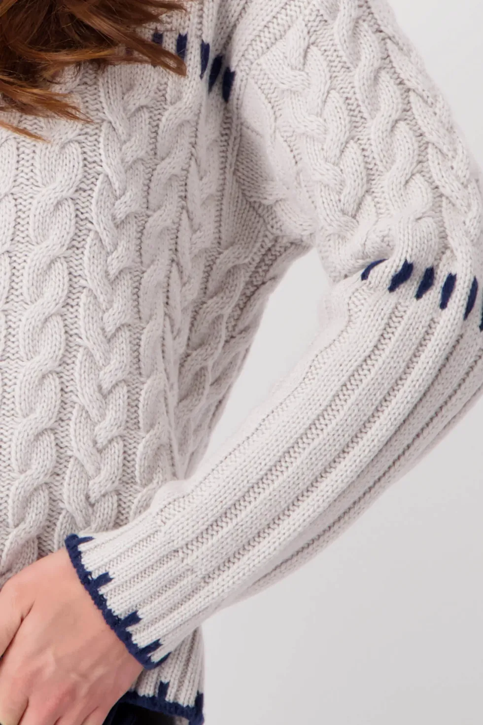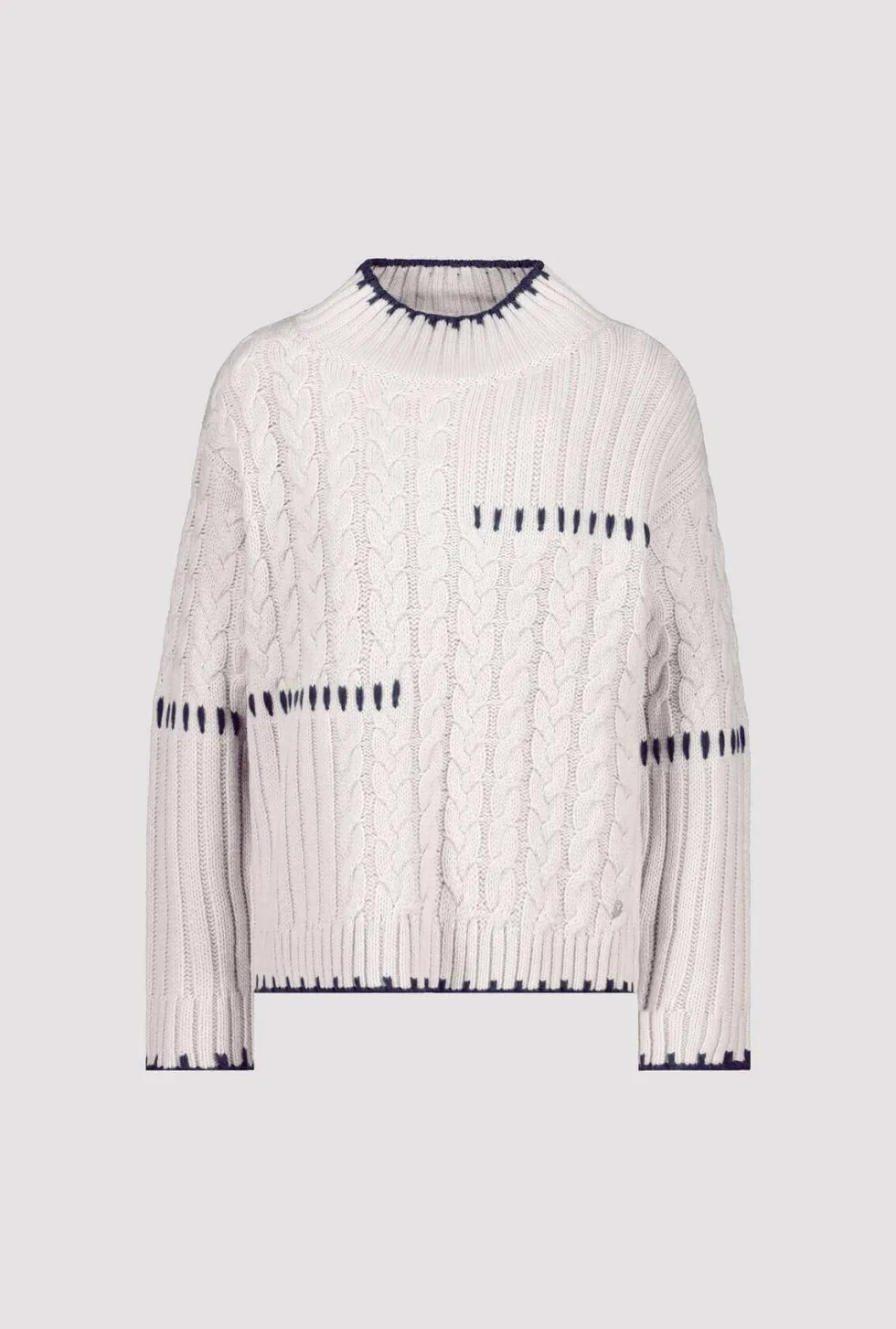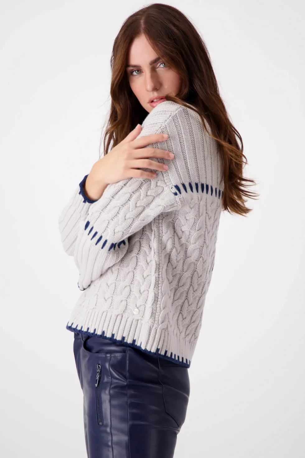 Stone Pullover 807464 by Monari at The Wardrobe 50% Wool; 50% Acrylic This fashionable sweater is made of a warm wool mix and features a plait pattern and rib structure as well as contrasting details.