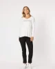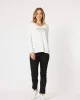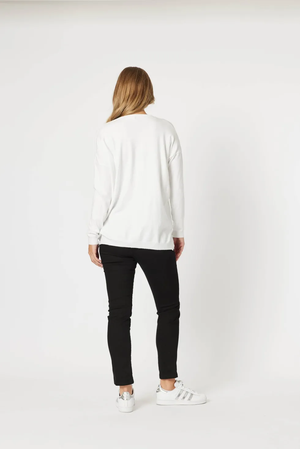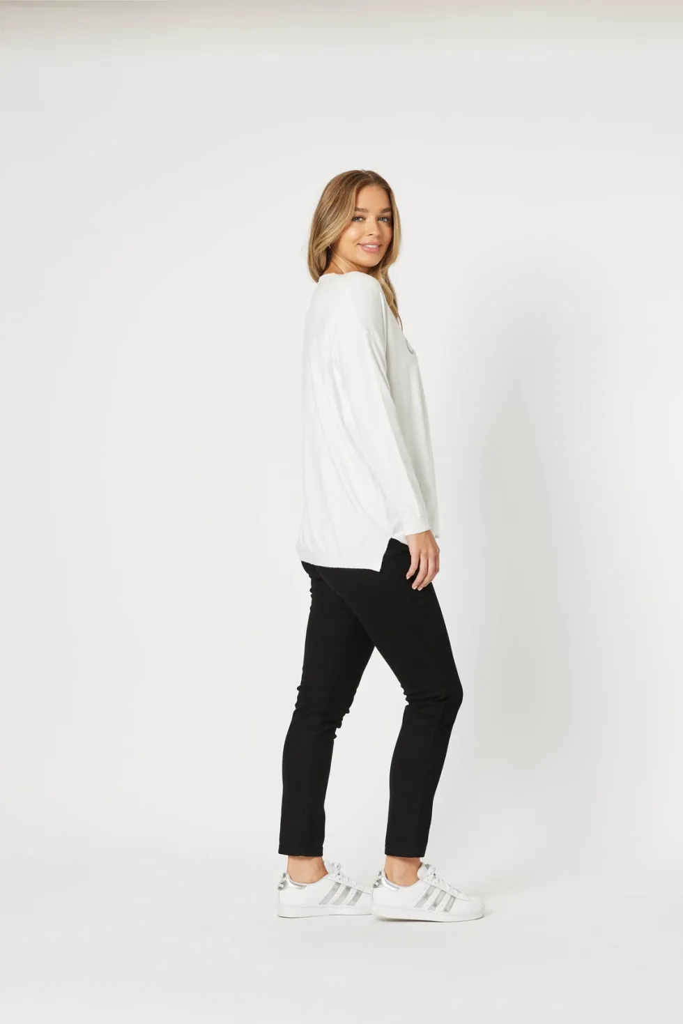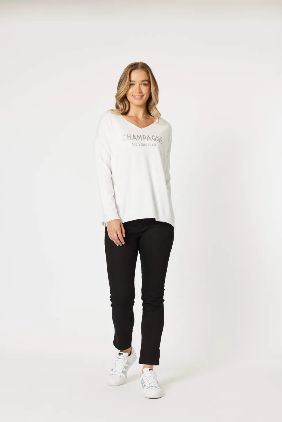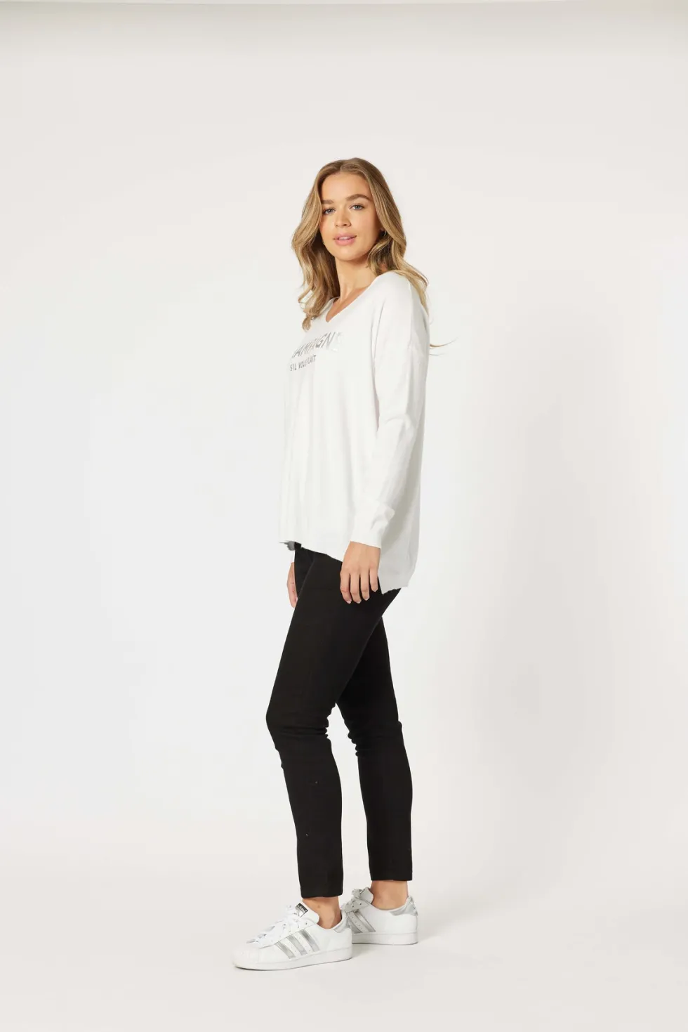 45206 – Champagne Knit – White/Black by Threadz at The Wardrobe Features: Shallow Vneck Drop shoulder, oversized style Long sleeve Relaxed fit Hi-Lo hem Fit Guide: Viscose/Polyester/Nylon Metallic printed text Soft stretch knit fabric for extra comfort Pullover style