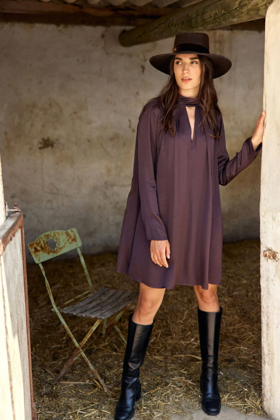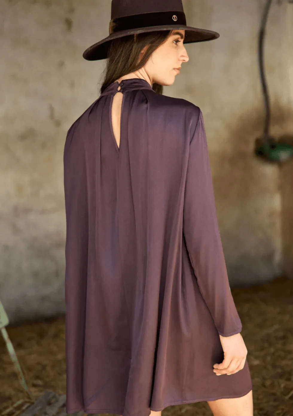Short babydoll dress in viscose. Slightly high collar. Teardrop in front, straight sleeves. 100% VISCOSE