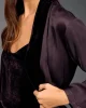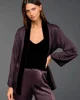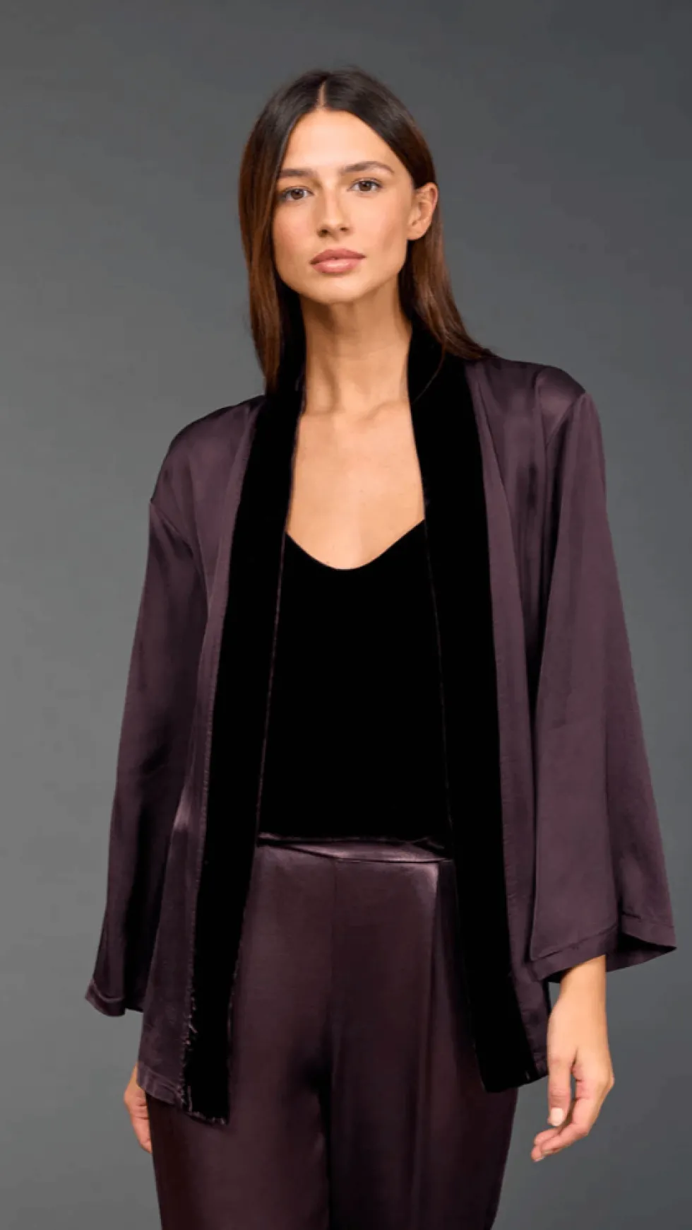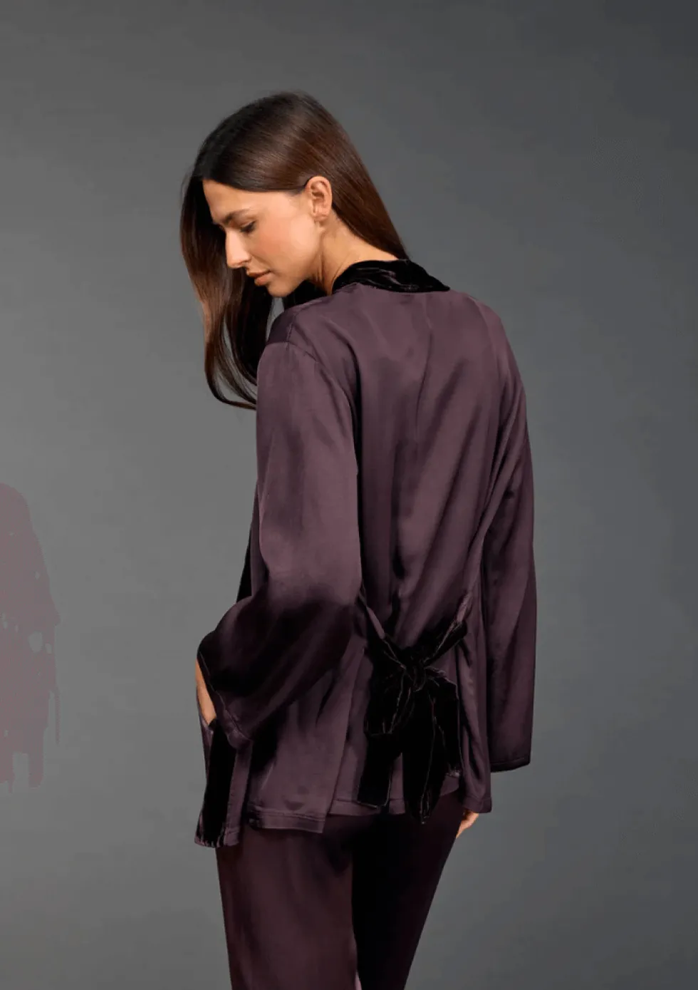 Amber Two – Material Kimono by Lauren Vidal at The Wardrobe. Kimono jacket in viscose and silk. Dropped shoulders. Viscose belt with belt loops at the waist. Wide velvet bands in front in viscose and silk. It is worn with the BELLA velvet top underneath. 82%VISCOSE18%SILK