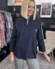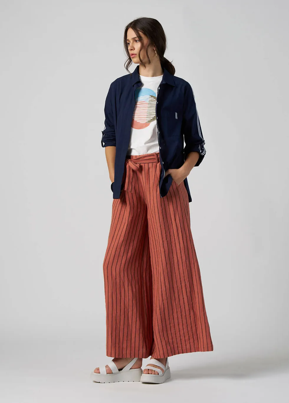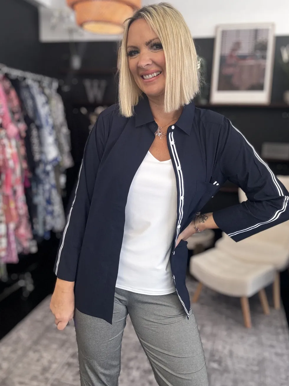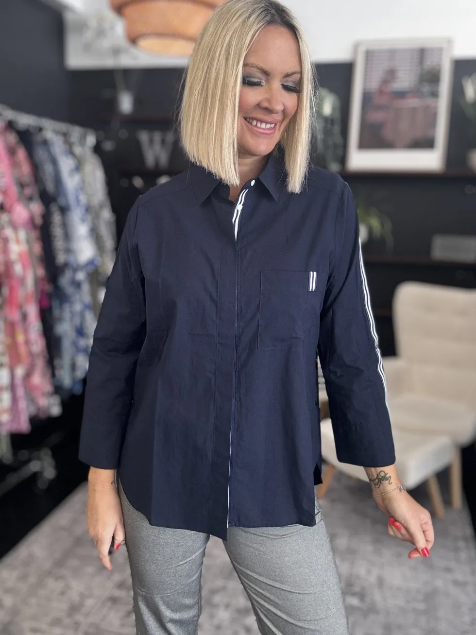 Cotton poplin shirt featuring striped tape trim detail beneath button stand and outer sleeve tabs.Split side seams fasten with gunmetal snap domes. 100% Cotton Gentle cold machine wash with like colours, using mild detergent. Do not rub/soak//wring/bleach. Do not tumble dry. Dry away from direct sunlight. Warm iron o
